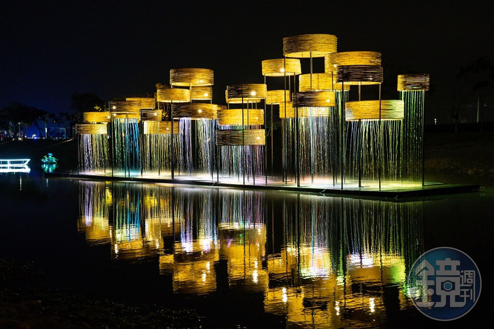 月津港的水流也是居民的共同記憶,禹禹藝術工作室的《月光紛飛》以水的漣漪為發想,一圈圈的水漣漪串起曾有的美好時光。而擅長竹編創作的禹禹藝術,另件作品《拾光》運用竹、木、鐵,在地面上打造出一個光痕交疊的種子,遊客可以走進作品內,感受燈光竹影交織出的夢幻空間。