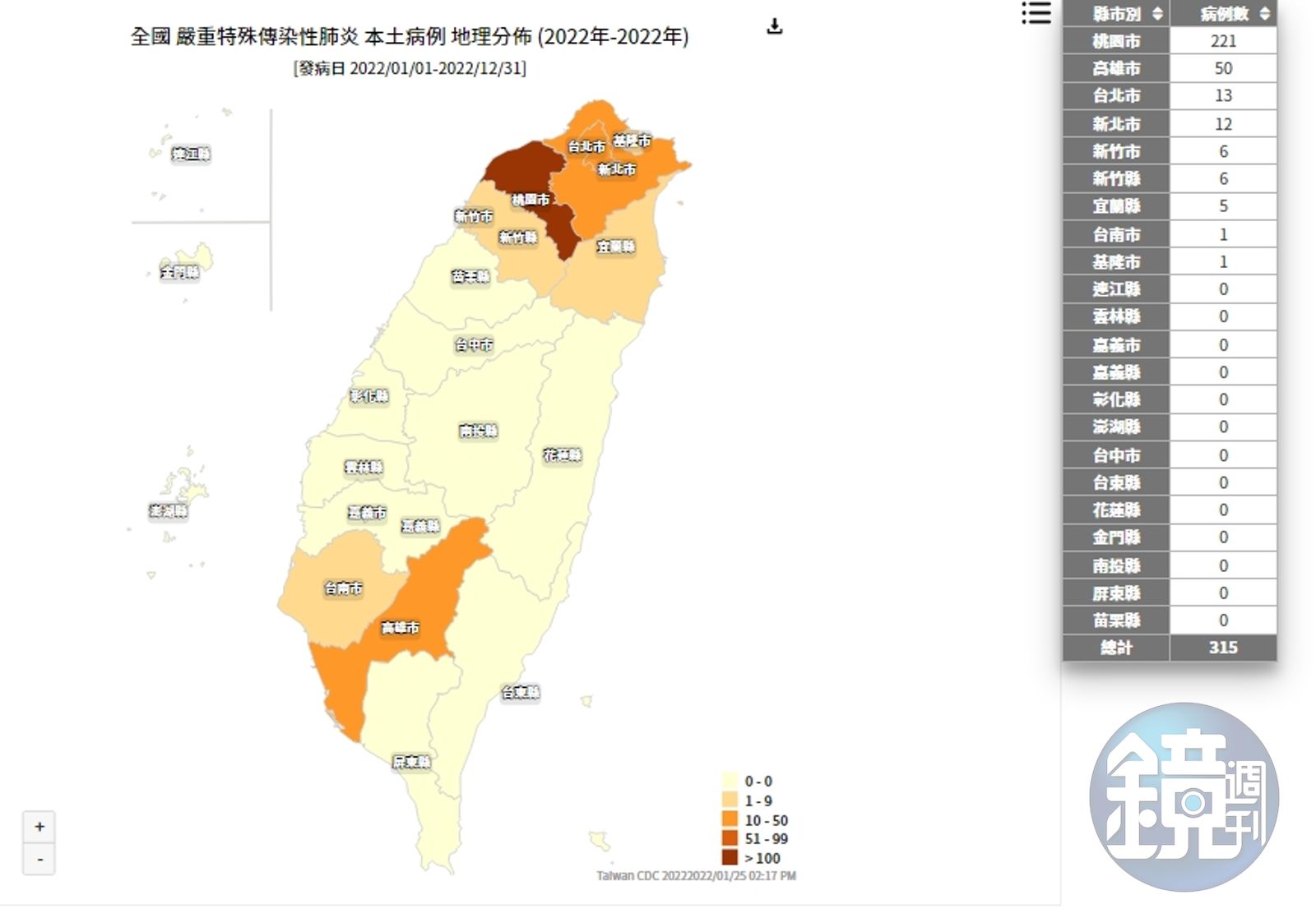截至稍早指揮中心宣布個案,國內確診個案已累積315名本土確診,確診人數攀升迅速,顯示Omicron傳染迅速,全台最多確診出現在桃園的221人,其次依序為高雄市50人、台北市13人、新北市12人、新竹市6人、新竹縣6人、宜蘭縣5人、台南市1人、基隆市1人。