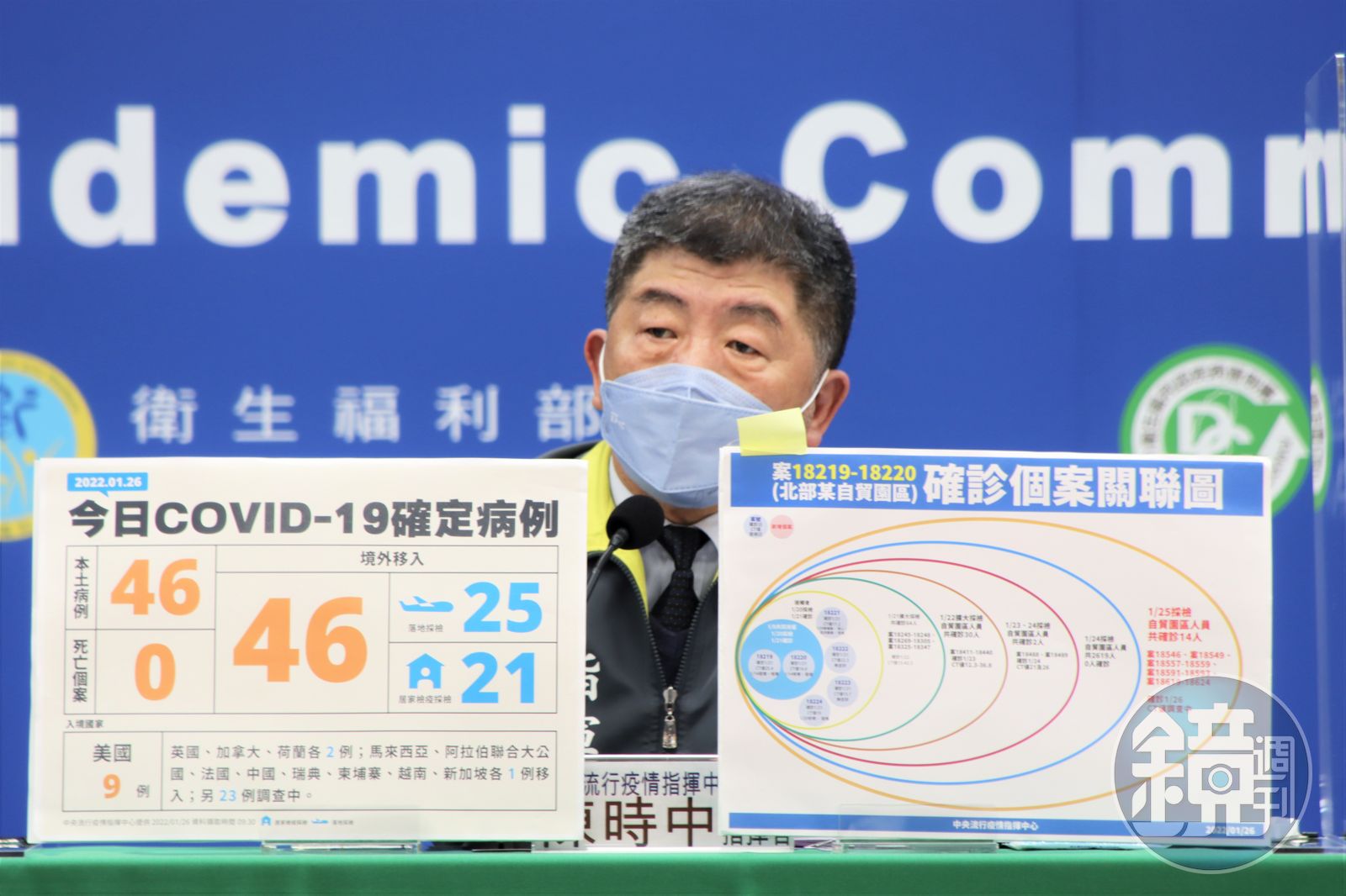 桃園今另新增一名20多歲女性(案18555)為不明感染源,陳時中表示,這名新個案目前尚未有找到與其他群聚有關聯之情況。根據指揮中心最新資料顯示,案18555於1月19日發病,有咳嗽、流鼻水、腹瀉與喉嚨痛等症狀,且已施打過兩劑AZ疫苗,個案於24日因自覺有症狀就醫採檢,今日確診。