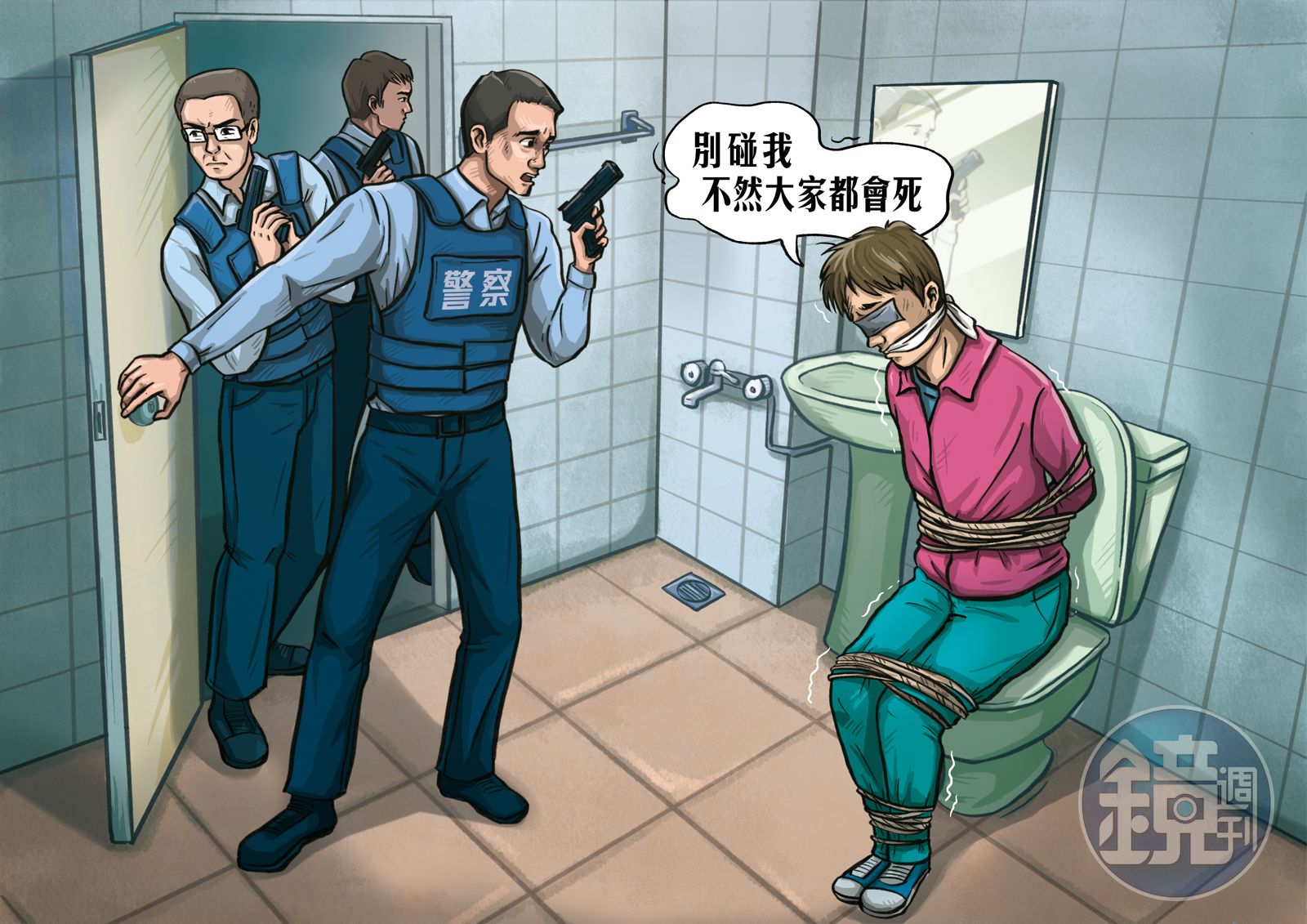 他告訴本刊:「我們在新北市鶯歌一間套房找到謝姓夜校生,當時他的眼睛被貼上膠布,嘴巴被毛巾勒住,身體被繩索五花大綁,坐在浴室馬桶上,臉上眼淚、鼻涕交雜,實在很難想像,被擄走的這8天他是怎麼撐過來的。」