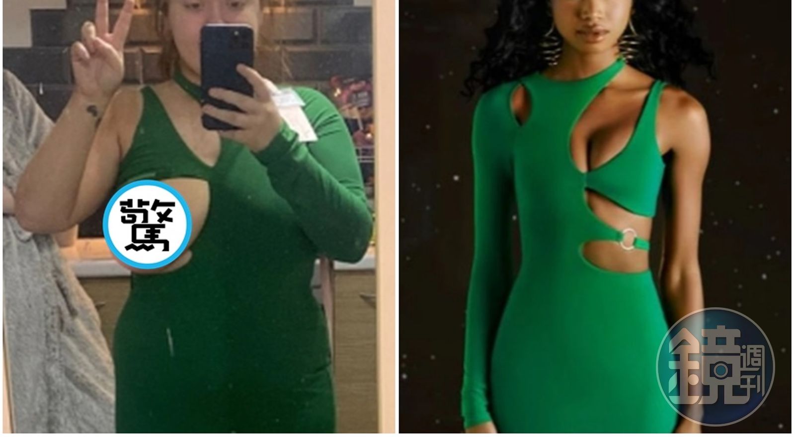 根據英國《每日郵報》報導,現年23歲的瑪瑰爾在網路商店尋找生日派對的性感戰服,買下一件帶點性感的綠色緊身裙洞洞裝,該禮服價格40英鎊(約新台幣1,500元),瑪瑰爾表示,平常她都購買尺碼12的服飾,但她考量該件連身裙較緊身,因此在下訂時故意勾選尺碼14,讓尺寸大一號,誰知道最後還是悲劇了。