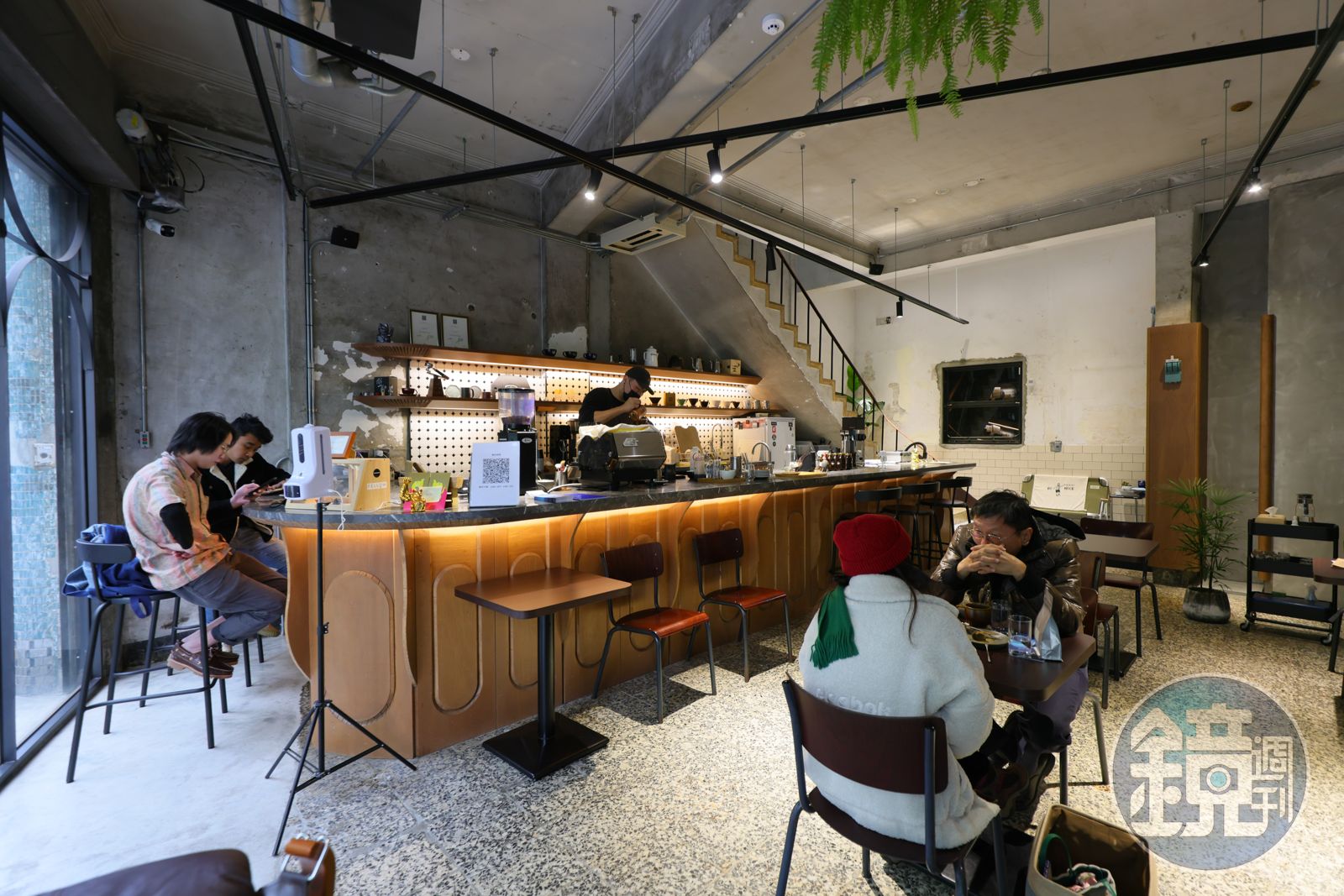萬祝號所在的建築是棟50年的老房子,過去是販賣船舶五金的商家,門上還掛著斑駁招牌,吳承駿刻意將它留下,他笑說:「沒錢換招牌啦。」沒想到後來反而成為亮點之一。仔細欣賞這棟建築物,就可以了解為什麼當時吳承駿會一眼就認定眼前這空間是開店絕佳選擇,磨石子地板、老窗框、長樓梯和灰泥牆,幾乎留著屋子原貌,醒目的咖啡吧檯則是留給咖啡師最寬敞的空間。