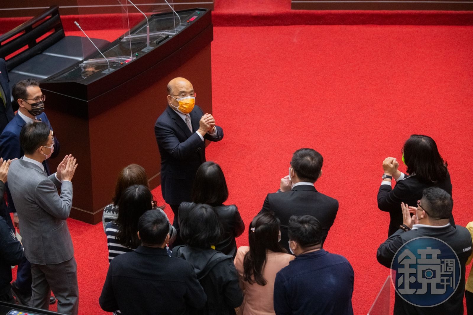 蘇貞昌也特別感謝立院全體立委的支持與鞭策,「在新年春節前夕,朝野立委展現智慧與專業,將攸關軍公教加薪 、社會福利、民生經濟,以及公衛防疫的中央政府總預算三讀通過」,讓政府能夠進一步為全民加薪、減稅