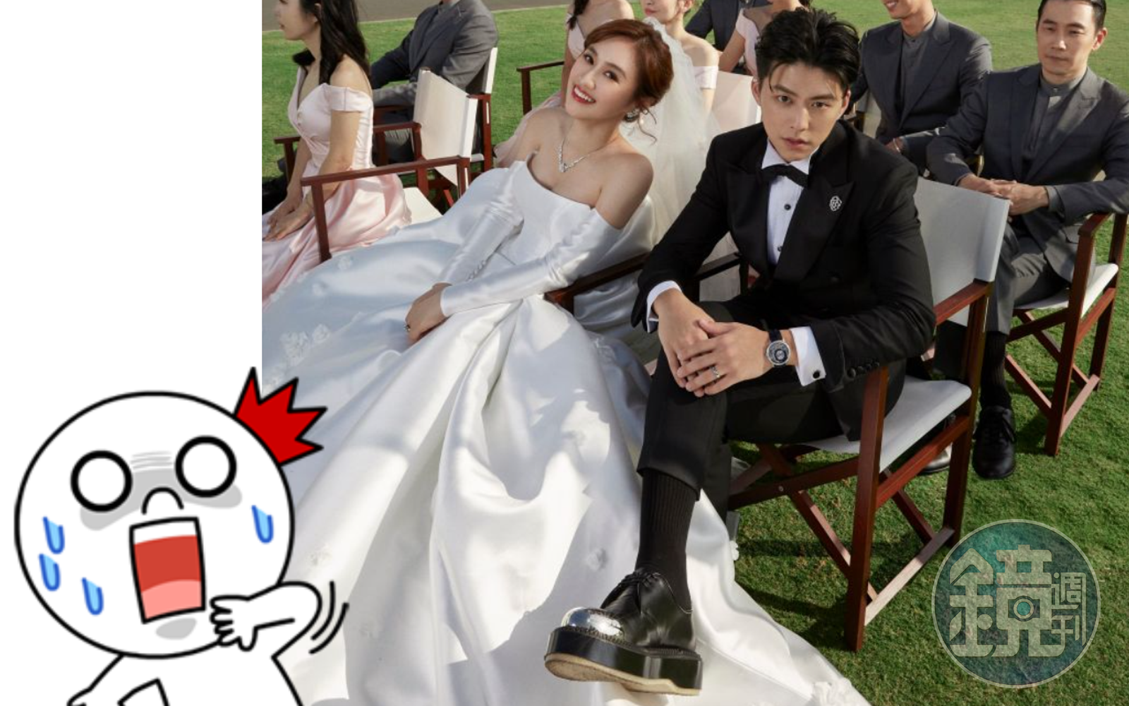 新婚夫妻同時也曝光了之前拍攝的夢幻婚紗照,張張都宛如偶像劇,但其中一張與伴娘、伴郎們的合照引起網友熱烈討論,看完紛紛留言:「我只看到男方鞋底好高啊!」「鞋底那麼高是?我就問~」