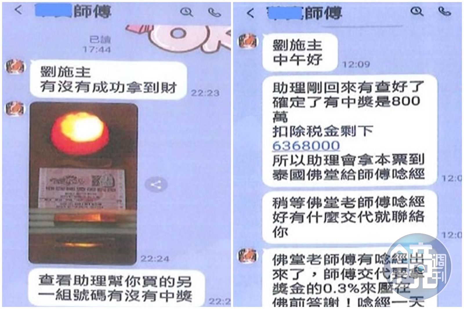 等彩券一開獎,劉婦接到網友告知,法師助理幫她購買的那張彩券中了600多萬元的大獎,再要求她網友先拿出獎金的0.3%,當作供奉寺廟的回饋金,接著又宣稱因為銀行的要求,劉女士必須再拿出獎金的1%支付抵押金。