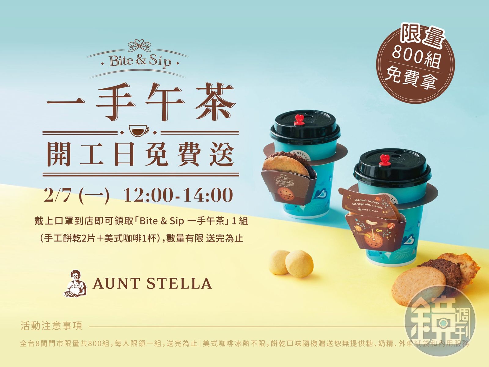 「Aunt Stella詩特莉」在開工第一天舉辦「開工送咖啡」活動,凡配戴口罩於12:00至14:00前往全台8間咖啡廳門市,即可免費領取「Bite & Sip 一手午茶」1組,內含美式咖啡1杯+含手工餅乾2片,全台限量共800組送完為止,希望可以在辛苦的開工日為大家帶來好心情。