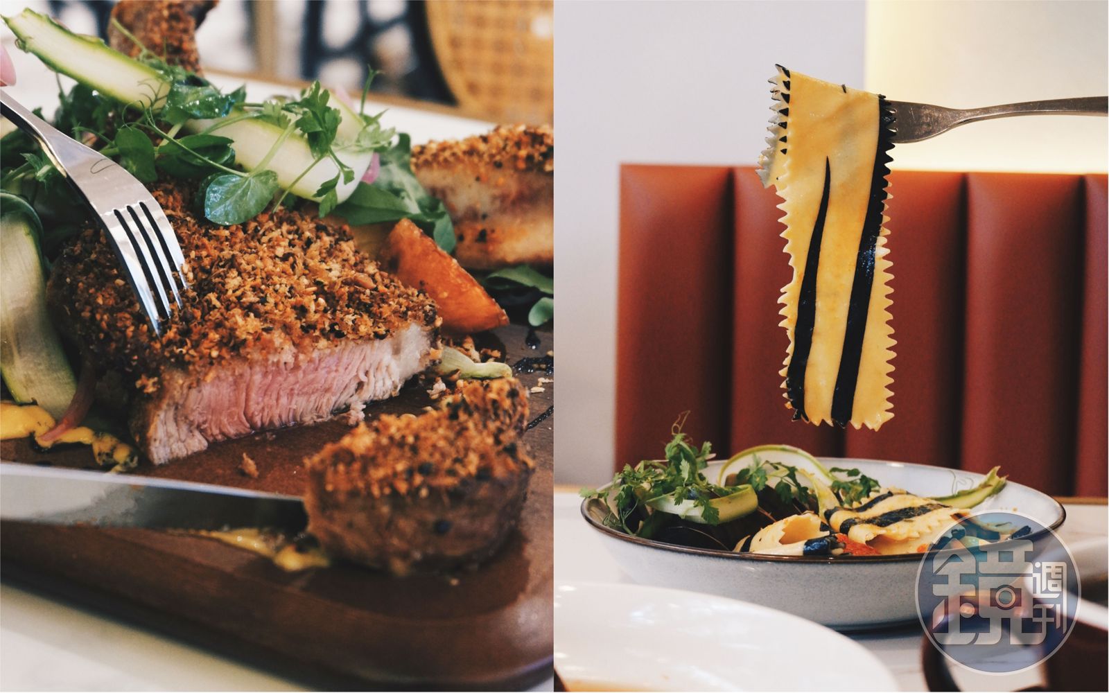 蘊含新年祝福的創意菜還有「福虎跳牆」,靈感來自佛跳牆,把豬腳、豬耳朵和虎掌製成高湯凍,包進手工義大利麵餃製成的福袋,酥炸後淋上老母雞干貝高湯,中西融合的概念十分有趣。