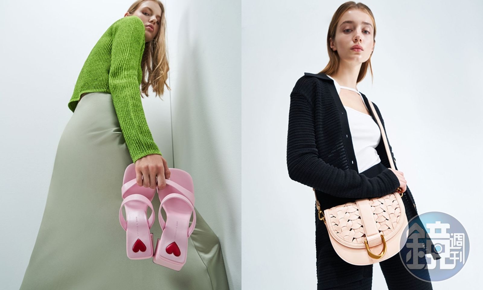 〈左起〉Amora雙帶高跟拖鞋NT$1,690、粉色Gabine編織馬鞍包NT$2,490。〈CHARLES & KEITH提供〉發布時間:2022.02.08 13:54 臺北時間