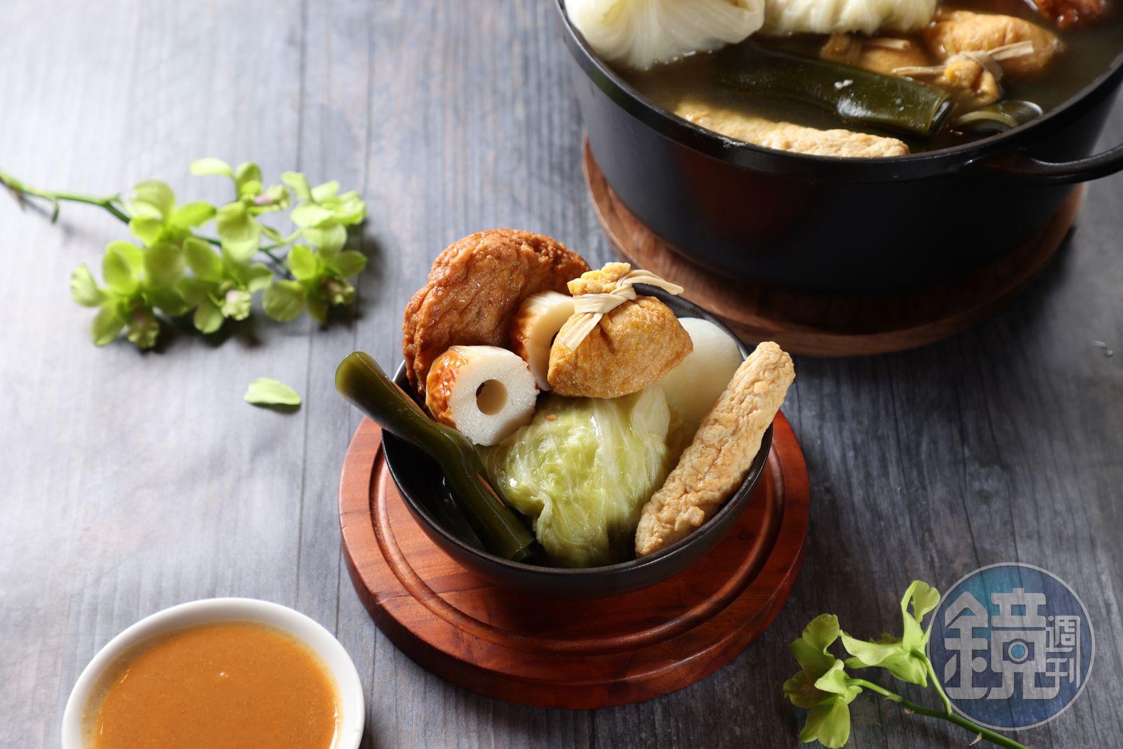 無論如何,我依添財的方法複製。先煮好昆布柴魚高湯,再將從大橋建成魚丸店葉老闆處買來的洋蔥圓餅天婦羅、黑輪、荸薺天婦羅放入高湯內。將蒸熟的高麗菜捲、熟透的菜頭放入燉煮。看到菜頭浸出淡金褐色,顯示已入味。至於高麗菜捲則有人喜軟爛、有人喜有咬勁,而有不同的自老滷中的取出時間。各食材取出後切塊裝盤,附上一盤特製沾醬即可上桌。至於沾醬,我也要到配方:台灣精研味噌加日本清酒、糖、水及辣椒粉,燉煮至合適的口味及濃稠度即成。當然,用料比例可能要自己抓出,一回生二回熟。