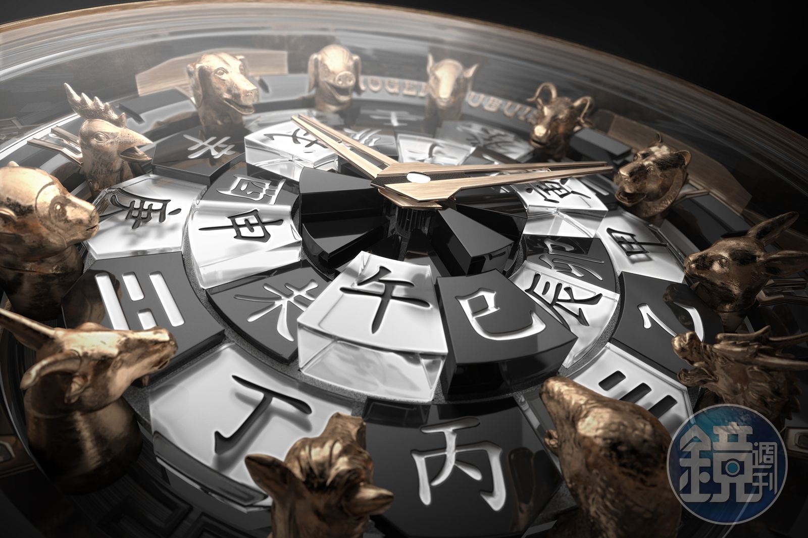 今年又一次進化的第三代十二生肖腕錶,羅杰杜彼同樣在面盤上做變化,直接十天干、十二地支的東方傳統曆法字樣放到面盤上,而且加入八卦中的四象;同時面盤上有元素符號的黑色與白底透明慕拉諾玻璃(聞名世界的威尼斯玻璃),透過手工組裝以不同高度錯置於錶盤中央,雙色的圖案由水墨藝術啟發,分別代表著明暗、 虛實、濃烈與寡淡,黑與白的配色,也頗有太極的意象。