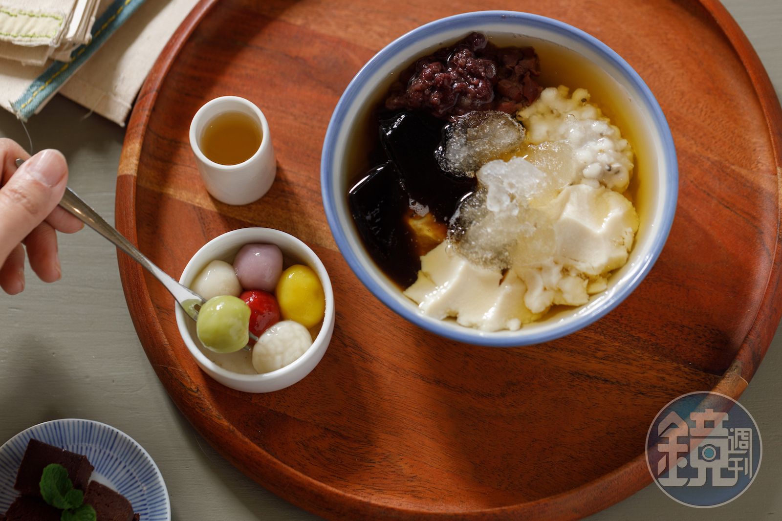 她拿出一杯綠色粉末,這不是日本抹茶,而是來自礁溪現磨的綠茶茶粉。「因為我選擇的糯米粉味道很好,所以希望加入的風味是清新的,這款綠茶不像抹茶有濃烈的苦,就只有淡淡的香氣。」其他像是天然的梔子花、紫薯、紅麴也都提供淡雅的清甜與色澤,不搶豆花的戲。白玉湯圓Q彈有嚼勁,無論在沁涼的檸檬糖水裡,或是與宜蘭百年老舖椪餅、小農雞蛋與溫潤的豆漿豆花結合,都是最稱職的亮點。
