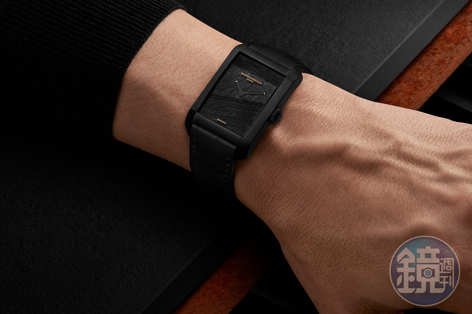 名士錶這次選擇漢伯頓系列(Hampton)為基礎,長方形的錶殼正如同畫框一般,而面盤上運用雷射加工的黃銅錶盤,來自黎凡特(Levant)的石材賦予漫射的啞光效果,最後再上一層僅有0.01mm的半透明保護漆,最終呈現的效果一如畫作立體。為了呼應整體的黑色,錶殼同樣採用DLC精鋼材質,同時裝載的機芯也特別改換黑色自動盤。值得一提的是,黑色的劍型指針應皮埃爾‧蘇拉吉要求,在末端加上金色裝飾。