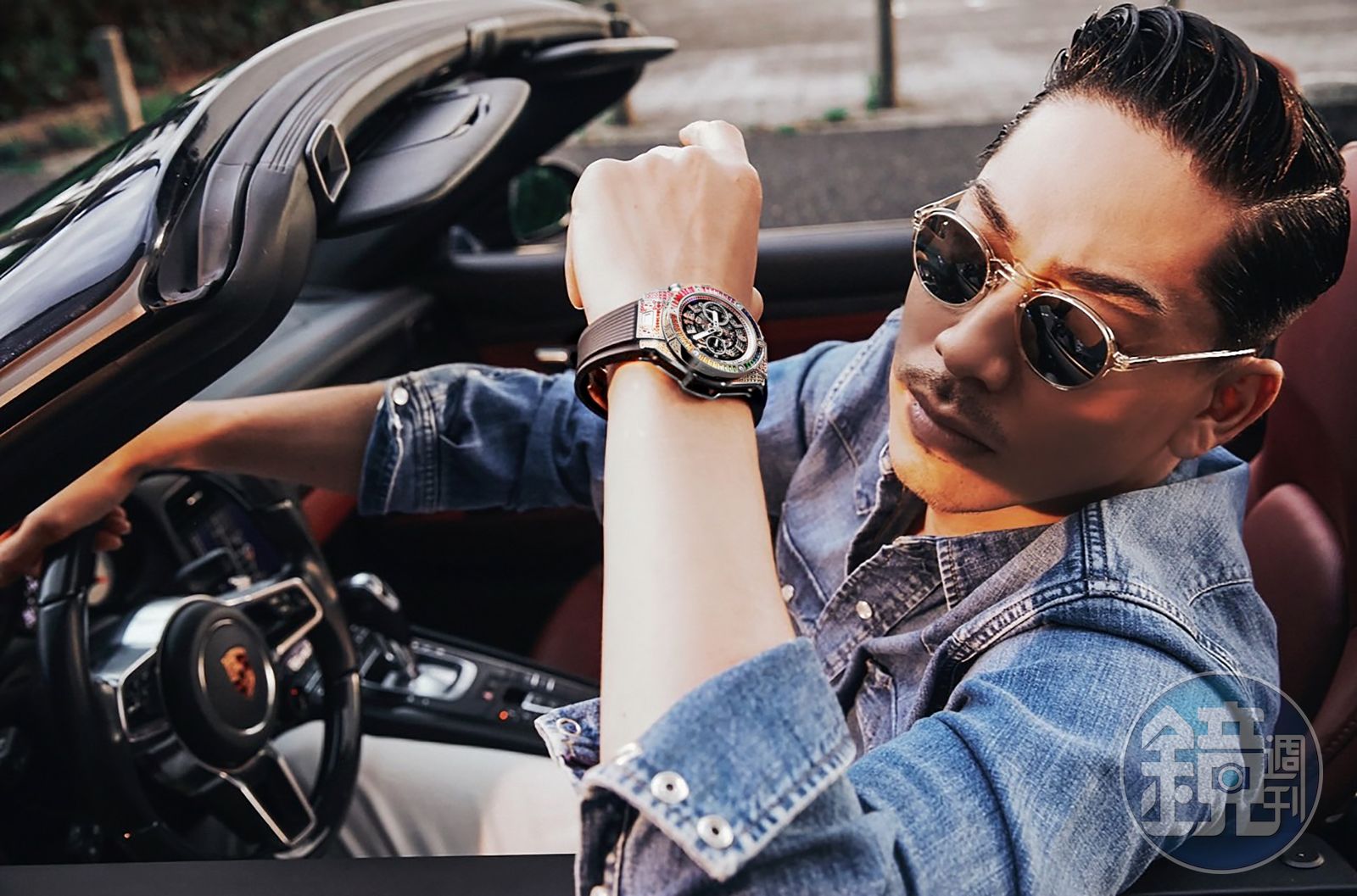 去年HUBLOT邀請AKIRA到台灣參加活動,無奈受疫情影響作罷,而AKIRA為品牌拍攝形象照,全部由他親自發想與搭配而成。他表示「BIG BANG UNICO鈦金彩虹計時腕錶」比較花俏,想要自由奔放的感覺,就借了跑車來拍攝。