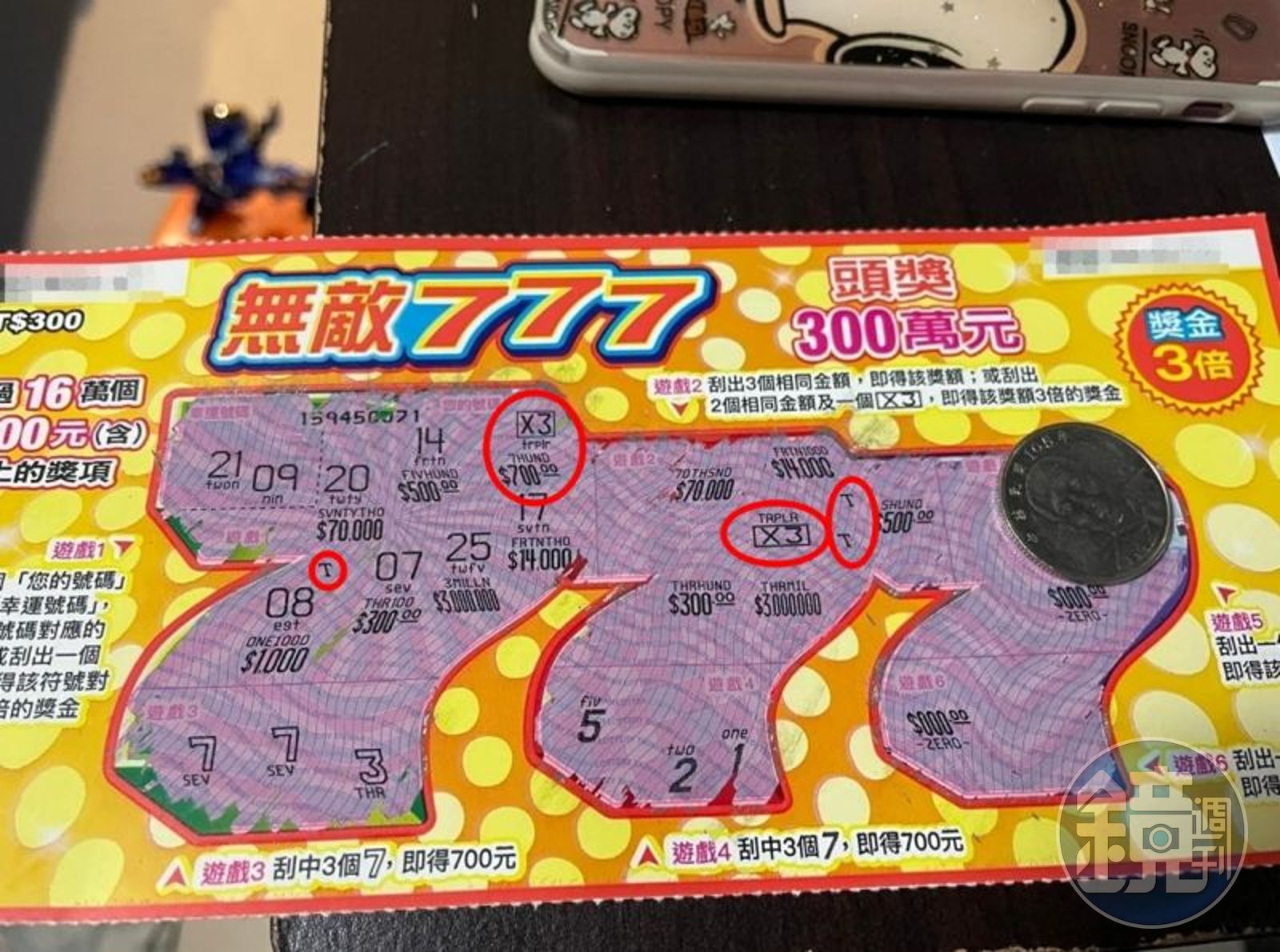 從這張照片來解析,遊戲1和遊戲2各出現「X3」的符號,整張刮刮樂還發現有三個英文字母「T」的代碼。根據「無敵777」刮刮樂規則,原PO即可獲得該獎額3倍的獎金,也就是700元的3倍,總計有2100元。