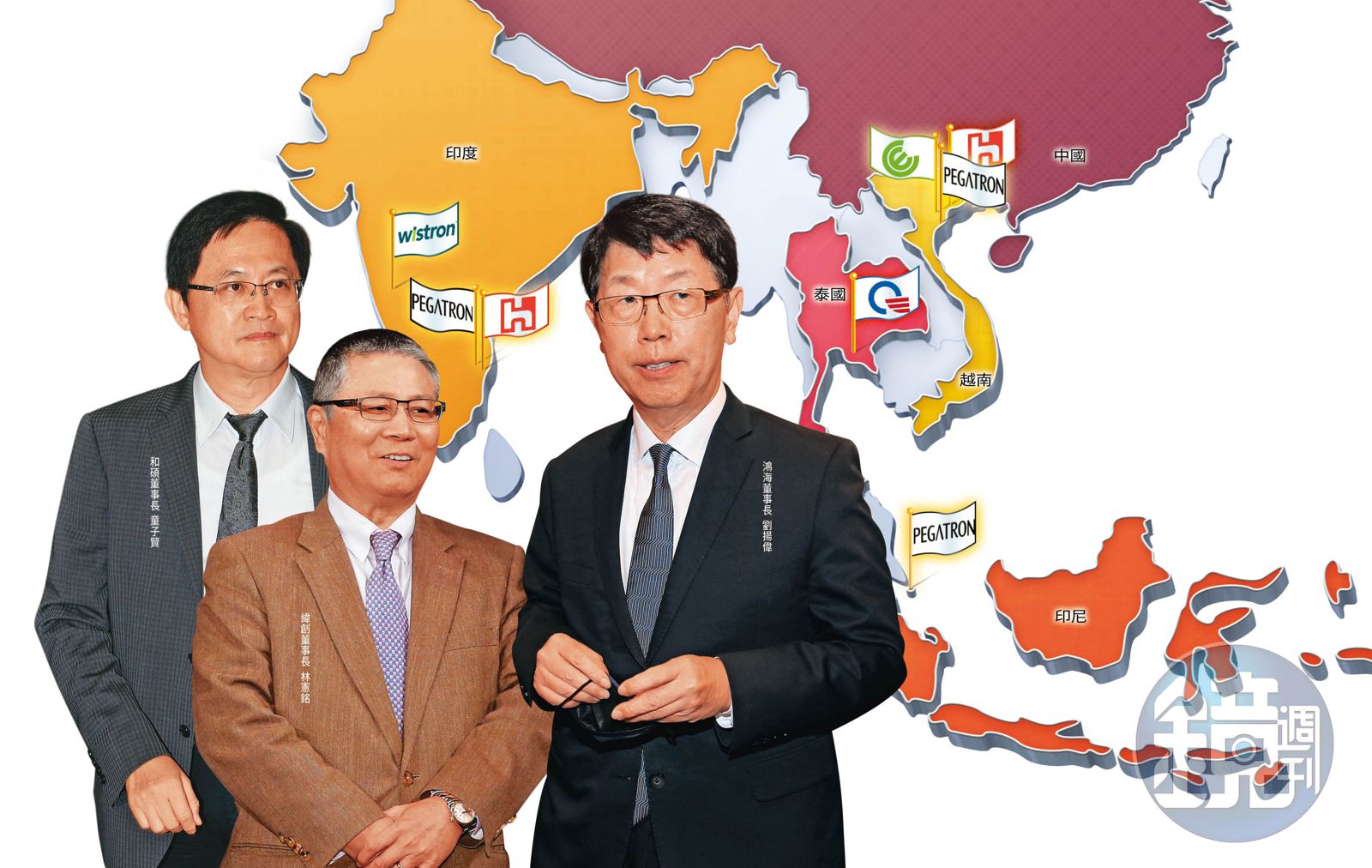本刊調查,不只電子代工龍頭鴻海南向投資動作大,包括和碩、廣達、緯創、仁寶在內的電子五哥,前進東南亞與印度布局的腳步也不停歇。經濟部投審會最新公布的數據顯示,去年台商對新加坡、印尼、泰國、越南、印度在內等國,投資金額高達58.1億美元(新台幣1620億元),成長幅度106%,僅次投資在中國的58.6億美元(新台幣1635億元)。