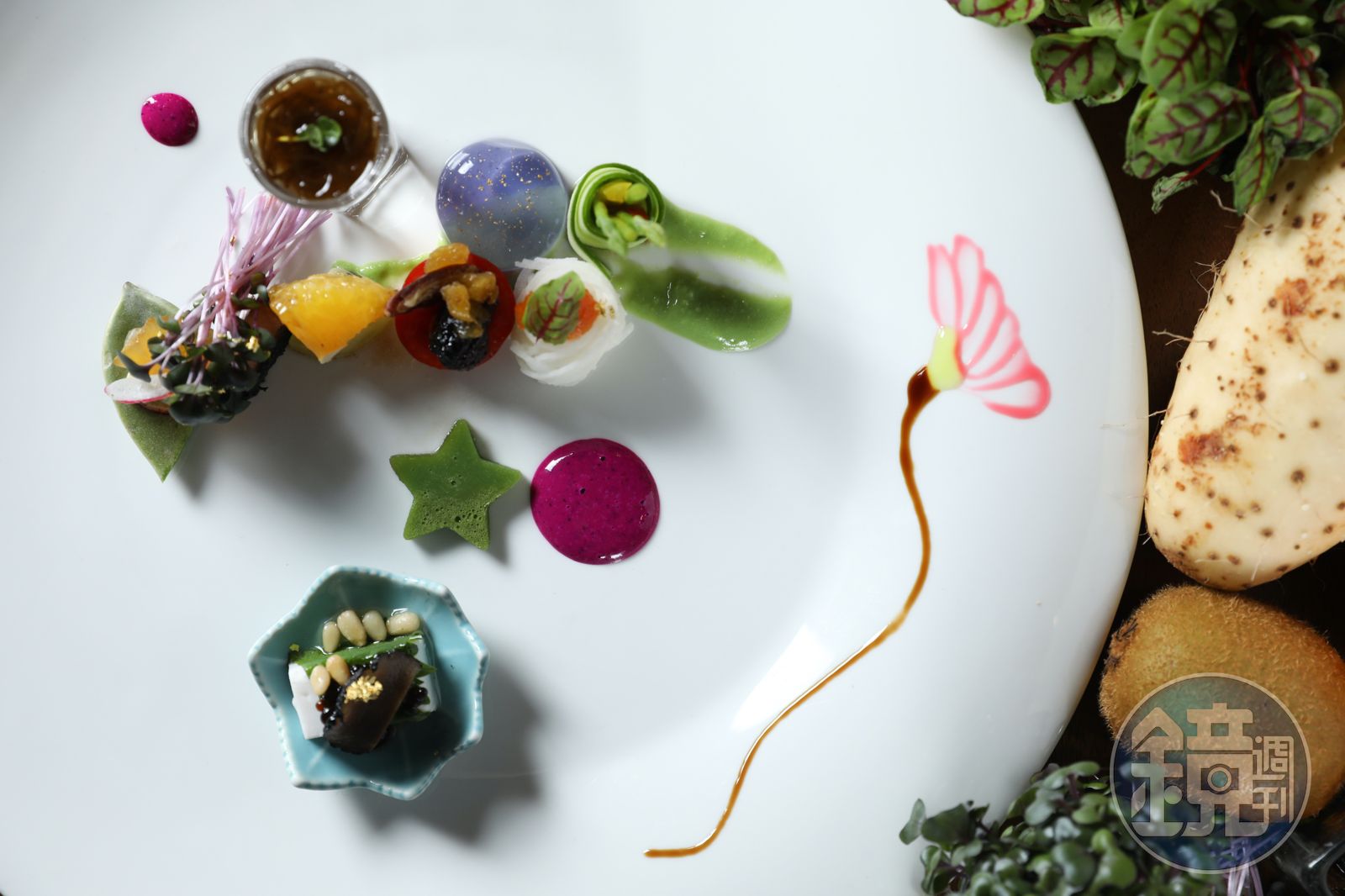 陽明春天的無菜單套餐,嚴選時令食材,完全不使用素料,綠竹筍產季一到就入菜,或用陽明山人參山藥燉湯,前年轉型成難度更高的無蛋無奶純素。拿下米其林綠星後,乘勝推出採納珍貴食材的「綠星套餐」,如黑松露、義大利羊肚菌、大陸東北的猴頭菇。前菜「璞真盛合拼盤」用日本山藥、沖繩水雲海藻和手工自製花生豆腐,點上醬油晶球,擺上用抹茶、綠豆糕製成的一顆星型羊羹,一盤盡顯蔬食的精細風味。
