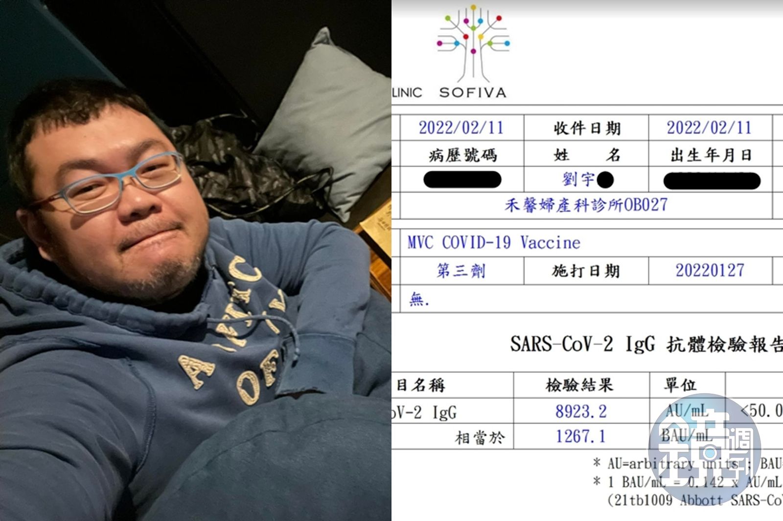根據四叉貓2月11日檢驗的抽血報告指出,其抗體數值來到了8923.2 AU/mL,而該數值是在其1月27日打完高端第三劑的15天後驗出,這也讓四叉貓興奮表示:「第三劑的抗體會再衝高一波,目前來到了8923.2 AU/mL新高峰,我是不是可以隨便亂跑惹!」