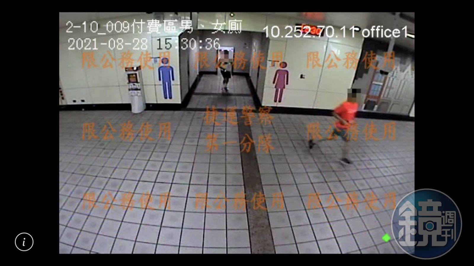 警方表示,接獲兩名被害男子報案後,調閱監視器及出入站紀錄追查,發現一名陳姓男子在民權西路將手機伸進廁間偷拍,僅2秒就被被害人發現追出,陳男一路拔腿奔跑,還不時轉頭查看,一度踉蹌跌倒,十分狼狽。