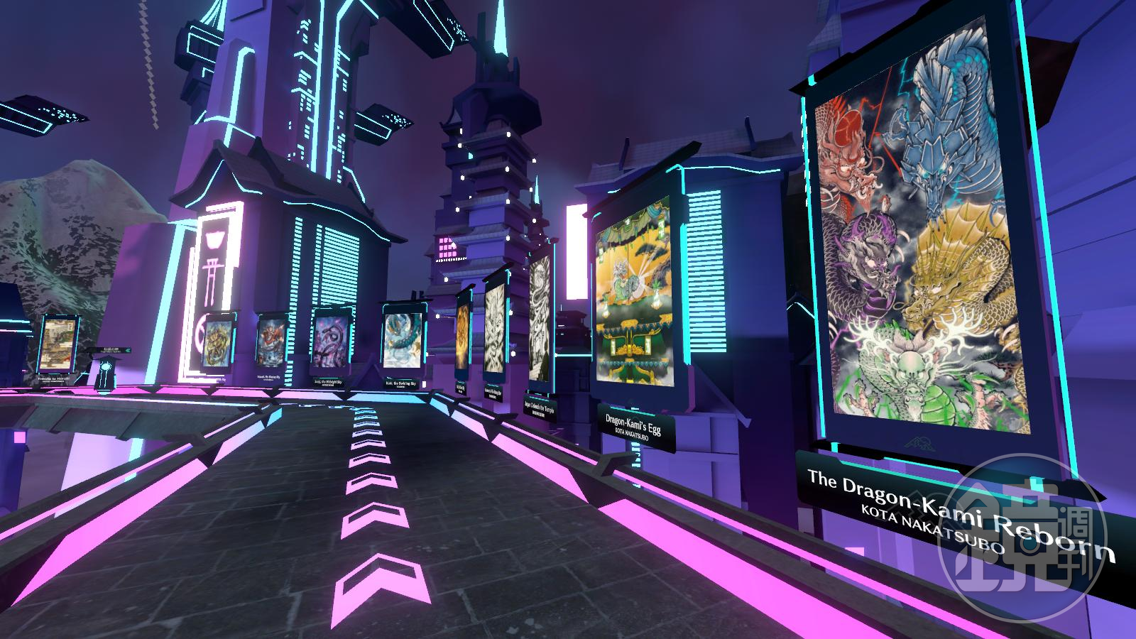 這次的〈神河:霓朝紀〉衍生自2004年〈神河〉系列世界觀,千餘年後的神河世界,成為融合傳統日式和風與賽博龐克的奇幻城市,在摩天高樓間,古老的「母聖樹」依舊聳立,而VR展參觀者可以透過頭戴式VR裝置,遊歷這座城市中A至F、共6個不同主題、卡牌及原畫的虛擬藝廊,並透過手中控制器與作品互動。有些美麗卡牌可以放大欣賞,或是進一步閱讀更多創作資訊;而各區還搭配不同主題音樂,帶給參觀者豐富的視聽饗宴。
