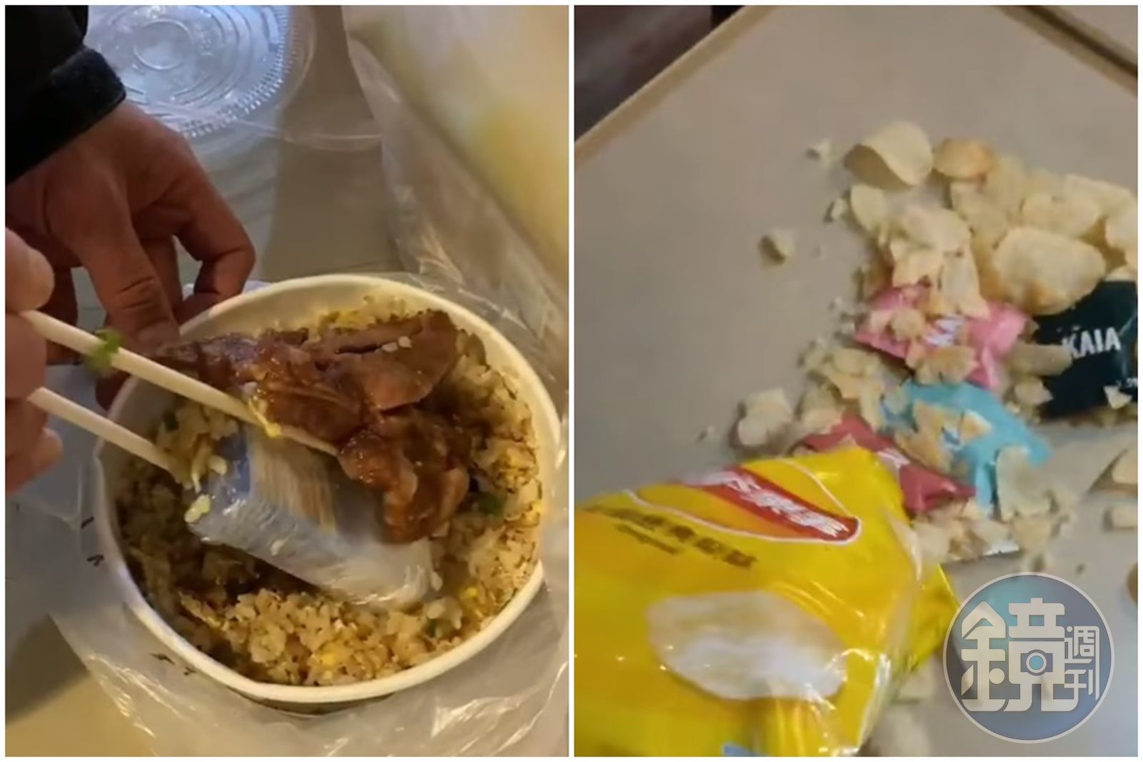 從王必勝秀出的違禁品影片可看出,有人把香菸盒藏進便當、洋芋片打開倒出竟發現許多疑似毒品的小包物品、一箱礦泉水拆開發現有高粱酒和香菸及打火機等。