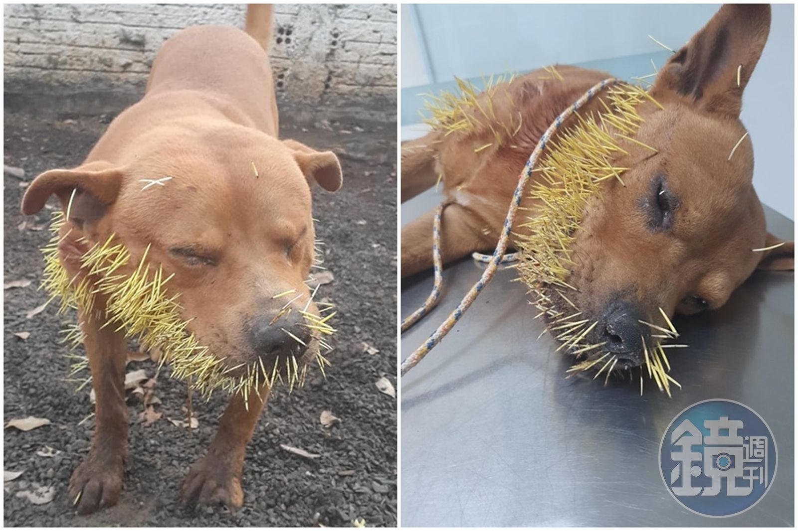 巴西一隻頑皮狗跟豪豬打架,結果被射了滿身刺。(翻攝Adriano Bertoline、Dr. Apolari - Araras臉書)發布時間:2022.02.23 16:45 臺北時間