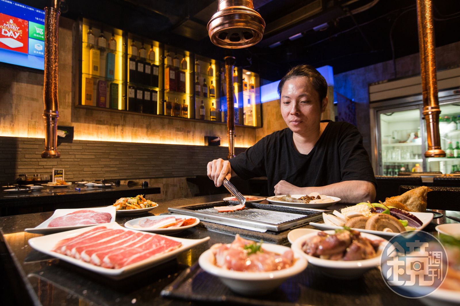 「我從小腦子裡就想著要賺錢,我在工作時,就會留意每一個可以賺錢的機會。」十幾歲就投資開飲料店,當兵抽到伙房兵,退伍後白天在團膳便當店當廚師,月薪7萬元,1個中午可以做9千人份便當,29歲在台北市創業開赤宴燒肉店。