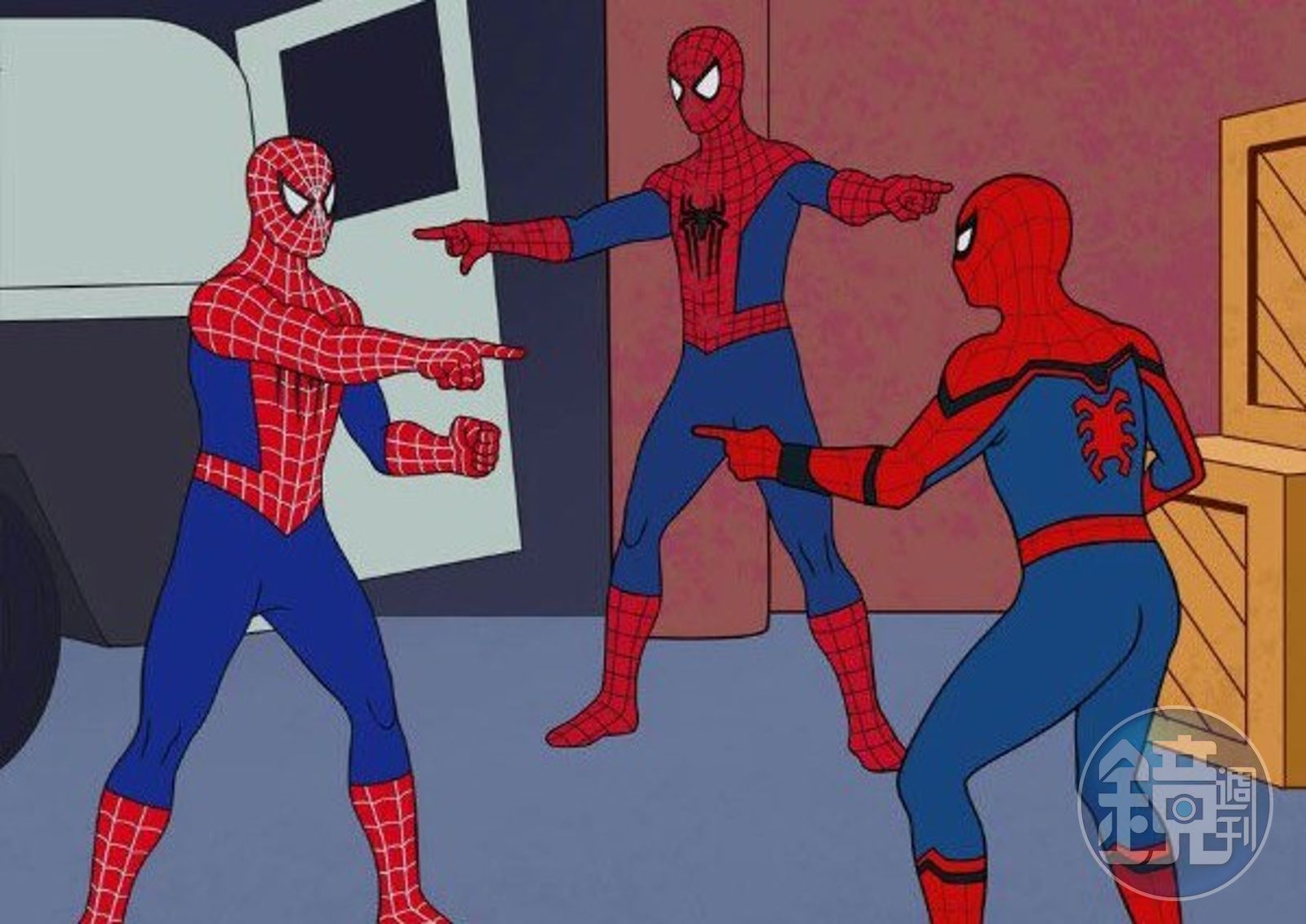 其實「蜘蛛人互指」的迷因,出自蜘蛛人在1967年的美國動畫《蜘蛛人》〈Double Identity〉,該集講述盜賊假扮成蜘蛛人,來藉此劫走價值高昂的藝術品,但被真正的蜘蛛人遇到,真、假2位蜘蛛人便互指著對方,表示自己才是貨真價實的蜘蛛人,這個場景也成為時下最知名的迷因之一;早在2018年,動畫電影《蜘蛛人:新宇宙(Spider-Man: Into the Spider-Verse)》中,就曾玩過這個哏。