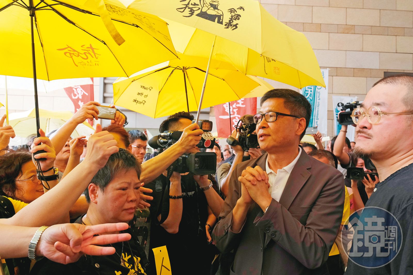 父後幾日,墳墓雕刻師傅以急件替他趕工,讓陳健民入獄前辦完喪儀;他沒通知友人父喪,告別式卻來了大批民主派人士,被稱為香港民主之父的前民主黨主席李柱銘長跪陳父靈前,旁人見狀,都跪了。「李柱銘跟我家人講,謝謝我爸爸生了一個孩子,為香港做這樣的事。家人很震撼,開始重新思考,我為何捲進民主運動。」辦完喪儀,陳健民入獄,反送中事件隨後爆發。