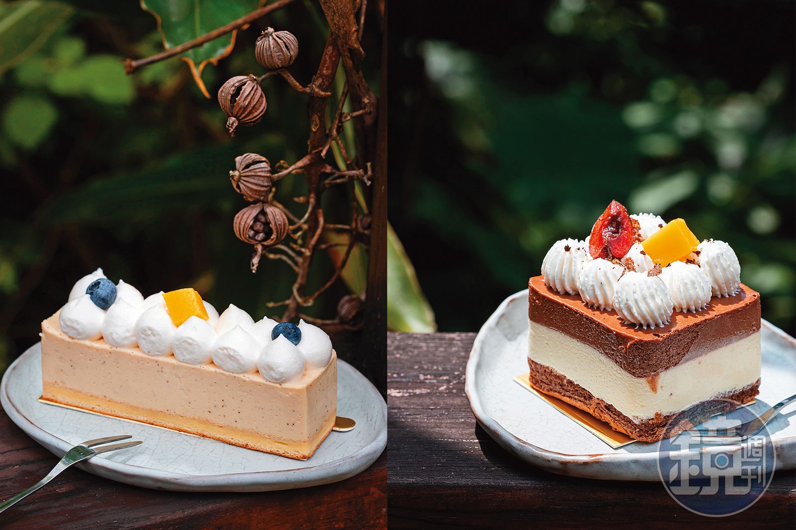 以加里山冠軍烏龍茶,搭配季節水果製作的「加里山烏龍茶」(左),是店內最受歡迎的甜點(120元/份);「馬告雙色巧克力」(右)將馬告的檸檬香茅氣息與巧克力巧妙融合。(140 元/份)發布時間:2022.02.27 07:57 臺北時間
