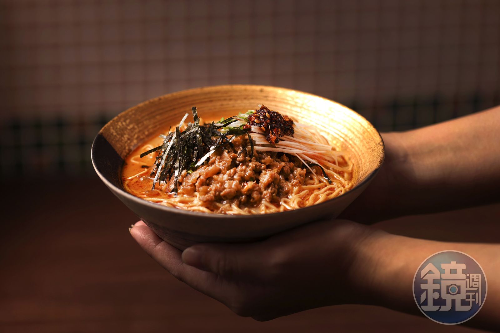 店裡「不主流」的還有麵條,張維軒特別拜託台中沙鹿傳承4代的老麵廠「峰光製麵」客製2款新鮮麵條,一細一粗,「細的比一般的細麵還細,試做好幾次才定案,中間來來回回,很怕老麵廠不接。」細麵擔綱「擔擔麵」的靈魂,與台中百年老店黑芝麻油、秘製辣油、台灣黑毛豬胛心絞肉拌炒的肉醬拌勻,吸哩呼嚕把麵條塞進嘴裡,細柔如麵線,但不過於爛糊,醬香濃郁。