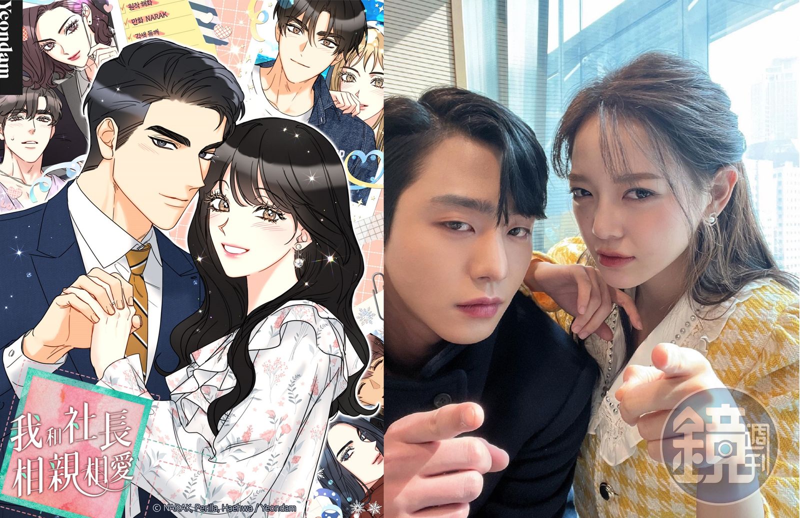 人氣網漫《我和社長相親相愛》(左圖)翻拍成連續劇,由安孝燮(右圖左)搭檔金世正(右圖右)演出。(左圖KAKAO WEBTOON提供,右圖翻攝自安孝燮Instagram)發布時間:2022.02.25 18:03 臺北時間