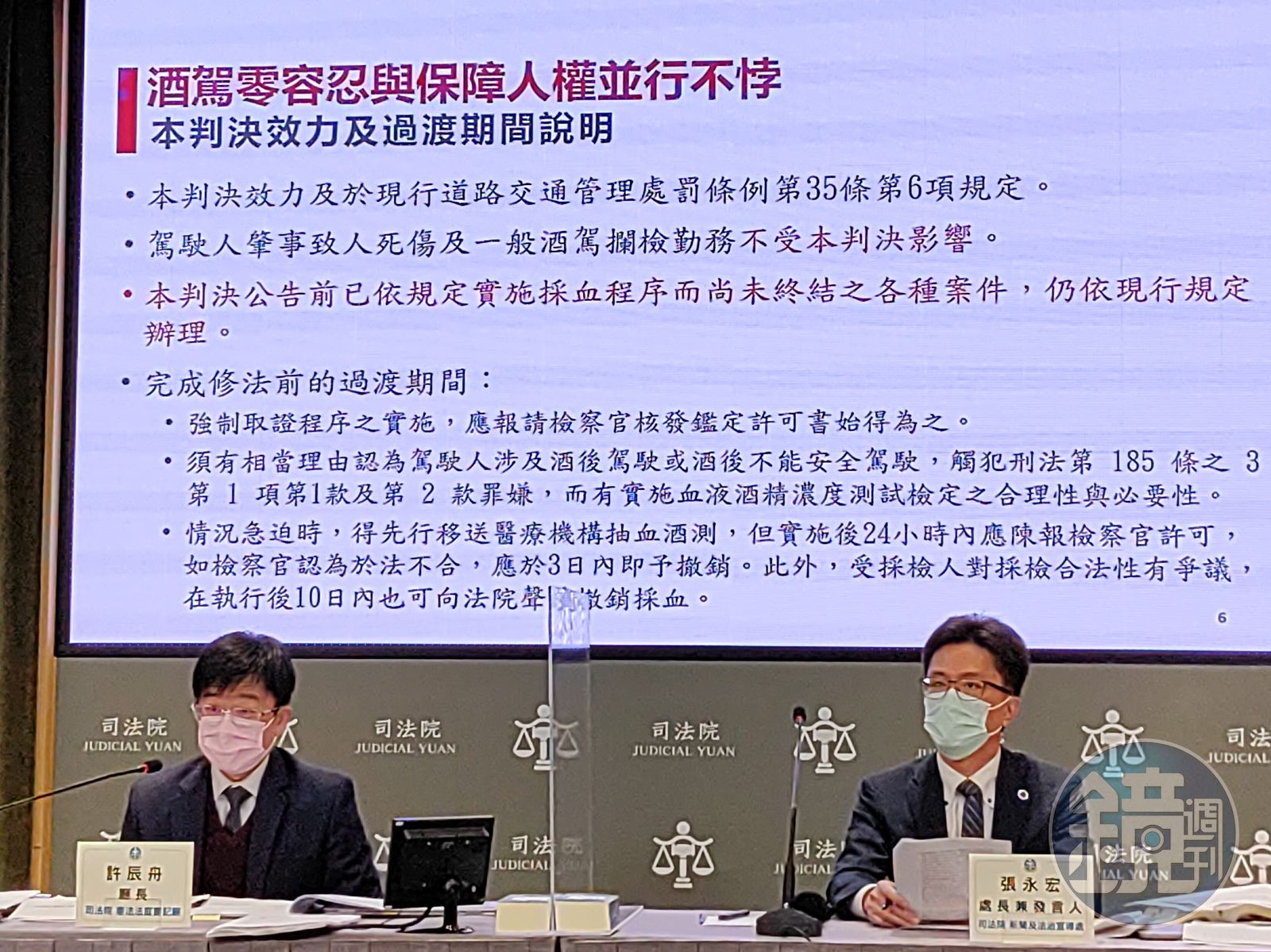 判決書指出,原本依《道交條例》規定實施相關採證程序而尚未終結的各種案件,仍依現行規定辦理,大法官要求相關機關應自這判決公告日起2年內,依判決意旨妥適修法。