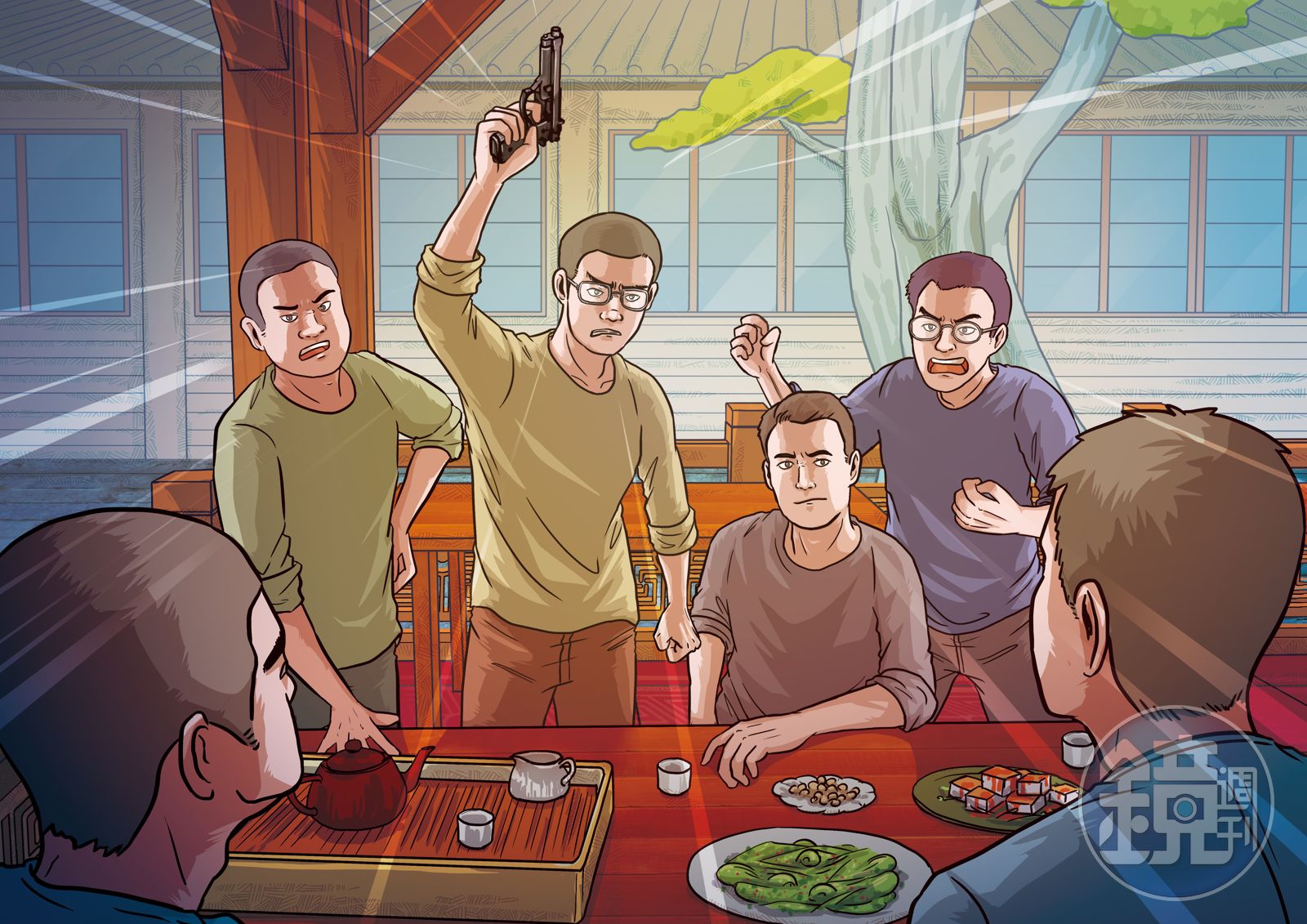 日信這方發現林明樺、黃博廷似乎無意溝通,當場嗆了一句:「談不下去了,我們走!」隨即起身準備離開。沒想到日信這方一名綽號「咖啡」的男子突然掏出一把槍,並以槍上的紅外線裝置,對著林明樺等四人的臉上瞄準,最後更直指李嘉軒、紀俊毅的額頭。