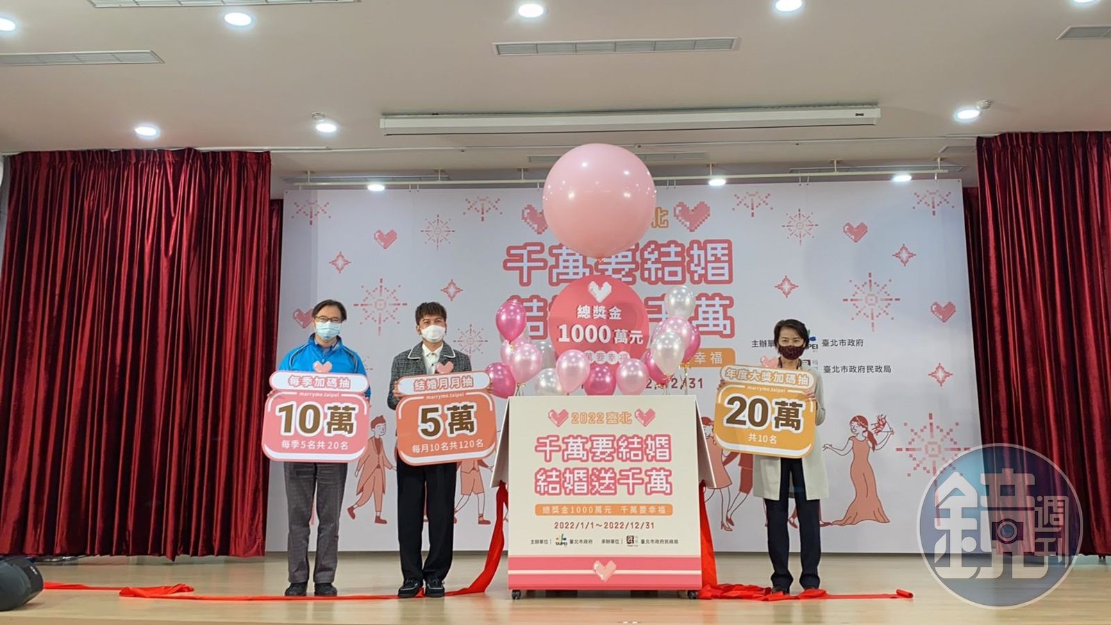 台北市副市長黃珊珊與民政局長藍世聰,今邀請到近日宣布結婚的藝人KID林柏昇,一同宣布北市的結婚抽獎新活動。
