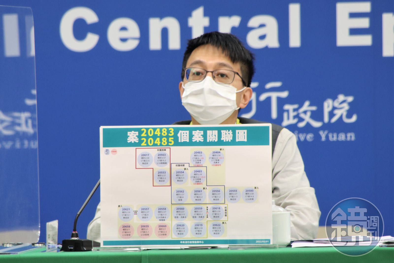 羅一鈞進一步說明感染源頭為家長的原因,因為家長在外工作或因生活所需有相關足跡,再把病毒從其他地方帶進家裡傳給小朋友,目前仍待基因定序釐清,究竟與哪一條本土傳播鏈有關。羅也提及,案20484於2月17日發病至今已14天,一般病毒傳到下一波間距為2、3天,因此推算已傳了4波,首波為家庭傳進幼兒園,第二為幼兒園傳其他家庭,第三為其他家庭群聚,第四則為透過職場再傳至其他家庭。