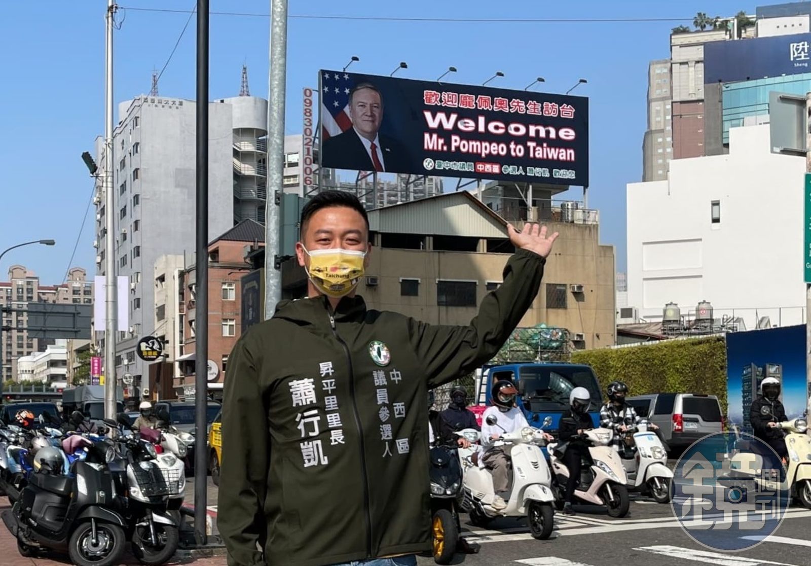 美國前國務卿蓬佩奧(Mike Pompeo)今(2日)晚將抵台展開訪問,台中市議員擬參選人、台中市西區昇平里里長蕭行凱特別在公益路掛上歡迎看板,結果釣出蓬佩奧本人親自回覆。
