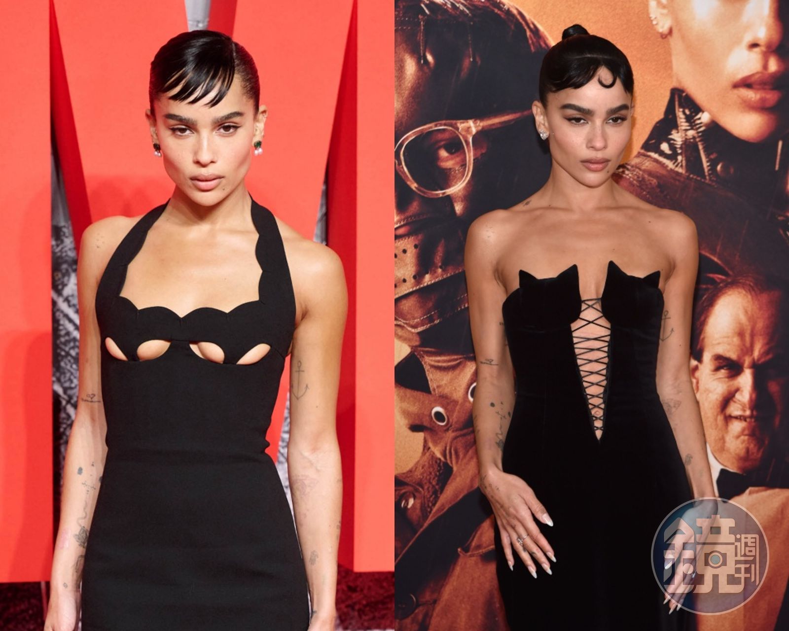 在倫敦的首映活動上,柔伊克拉維茲身穿YSL的訂製低胸晚禮服,但胸前的鏤空花紋看起來就像是蝙蝠俠的標誌。至於在紐約的首映活動,則換上了服裝設計師Oscar de la Renta的訂製低胸晚禮服,用蕾絲的設計在胸口製造出貓頭的圖案,不得不說儘管沒有大行頭上身,但結果可說超用心。
