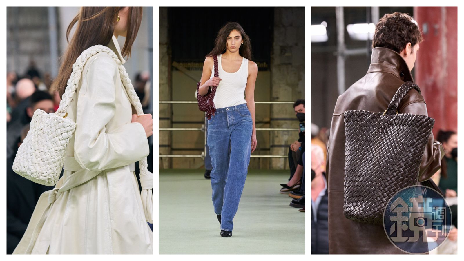 模特兒俐落的造型,搭配手工編織水桶包款,讓新設計總監 Matthieu Blazy 交出漂亮成績單。(BOTTEGA VENATA提供)染製典雅的酒紅色、清爽的白色、奶油黃又或是柔和的玉芯黃,Kalimero 有著代表冬季的飽和色調,包身上綴著金色的謬斯黃銅,帶來精緻巧妙的點綴外,並附有皮革抽繩內帶,增添包款實用功能性。