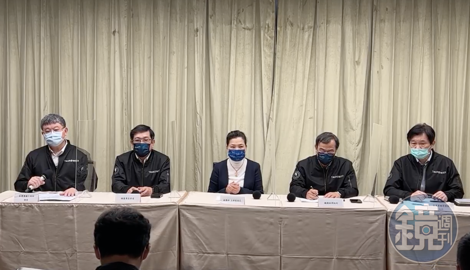 台電晚間針對0303全台大停電召開記者會,出席者有經濟部部長王美花、台電董事長楊偉甫、台電總經理鍾炳立、台電發言人張庭抒、專業總工程師吳進忠。