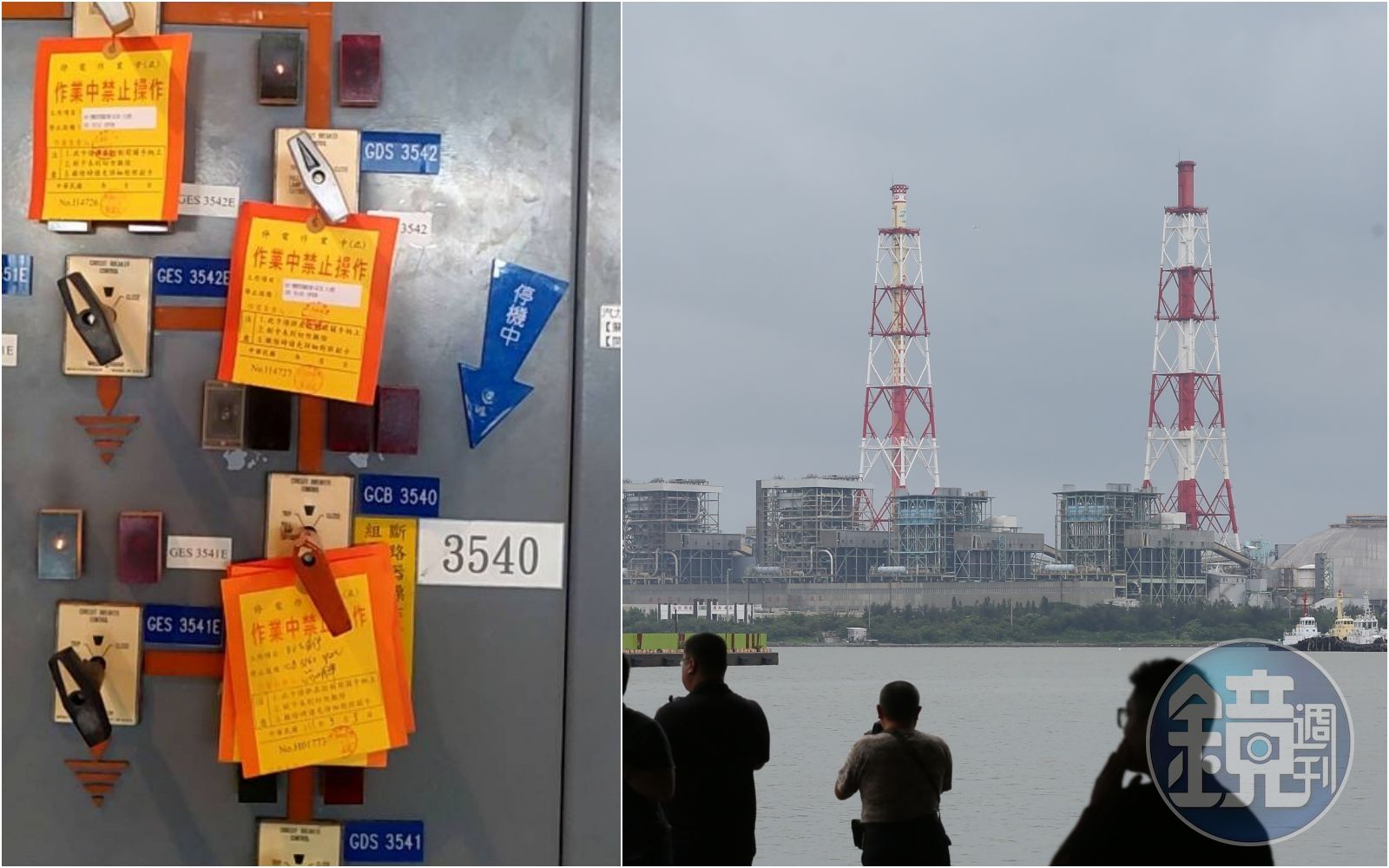 興達電廠(右)大停電後的開關場面板蒐證照曝(左),造成設備短路的3541開關上「作業中禁止操作」吊牌已被取下。(左圖為讀者提供,右為資料照)發布時間:2022.03.05 15:04 臺北時間