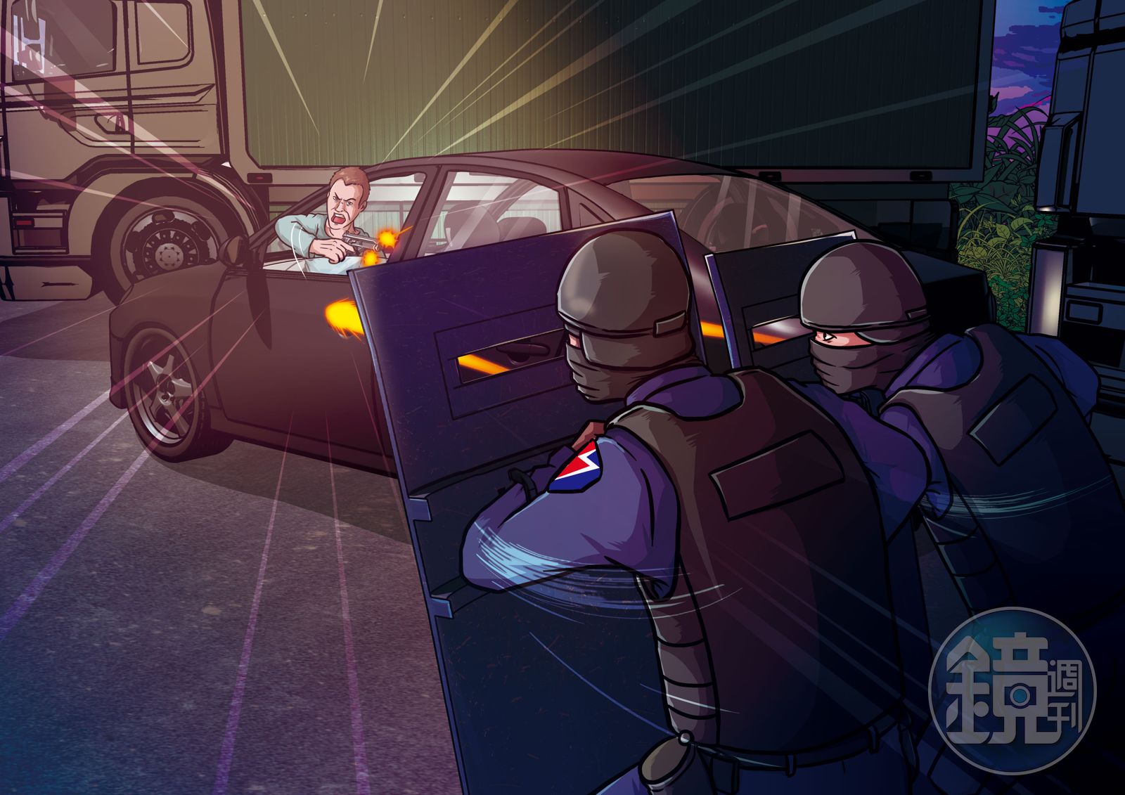 2019年7月10日凌晨4點多,陳宏宗開贓車帶著槍出發,警方早在十公里外的必經路口架好監視器,所有人就定位。陳宏宗一現身,陳昭谷立刻開了一輛裝有防彈玻璃的大卡車衝過去,攔住他的去路,緊接著現場指揮官林明佐(現任台中市警局刑警大隊大隊長)也率員駕駛另一輛卡車堵住他的車尾。