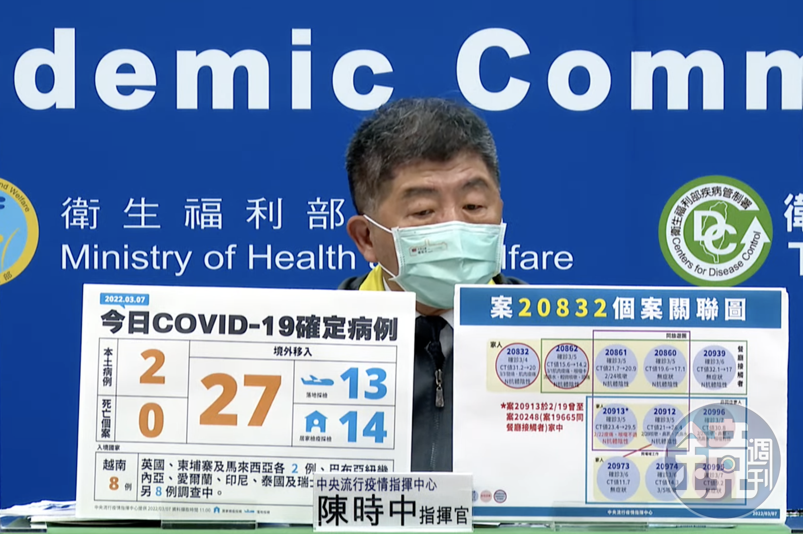 指揮中心統計,截至目前國內累計6,453,315例新型冠狀病毒肺炎相關通報(含6,432,364例排除),其中20,869例確診,分別為5,351例境外移入,15,464例本土病例,36例敦睦艦隊、3例航空器感染、1例不明及14例調查中;無新增空號病例,累計134例移除為空號。2020年起累計853例COVID-19死亡病例,其中839例本土,個案居住縣市分布為新北市413例、台北市322例、基隆市29例、桃園市28例、彰化縣15例、新竹縣13例、台中市5例、苗栗縣3例、宜蘭縣及花蓮縣各2例,新竹市、南投縣、雲林縣、台南市、高雄市、屏東縣及台東縣各1例;另14例為境外移入。