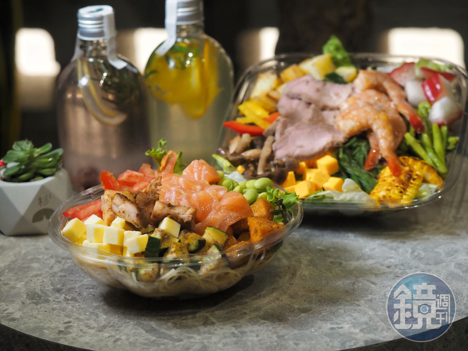 想另外加購點動物性蛋白質也沒問題,沙拉餐盒裡的肉類往往給人水煮的乏味印象,但杉以舒肥手法處理紐西蘭牛菲力、香草豬里肌、雞胸肉等肉類主菜,再賦予奶油、白蘭地、地中海香料、蔥油等風味,吃來軟嫩且具層次,少了在吃苦行餐的感覺。除了肉類,還有生鮮鮭魚、鮭魚卵、鮮蝦等選擇,滿足了海鮮控的需求。