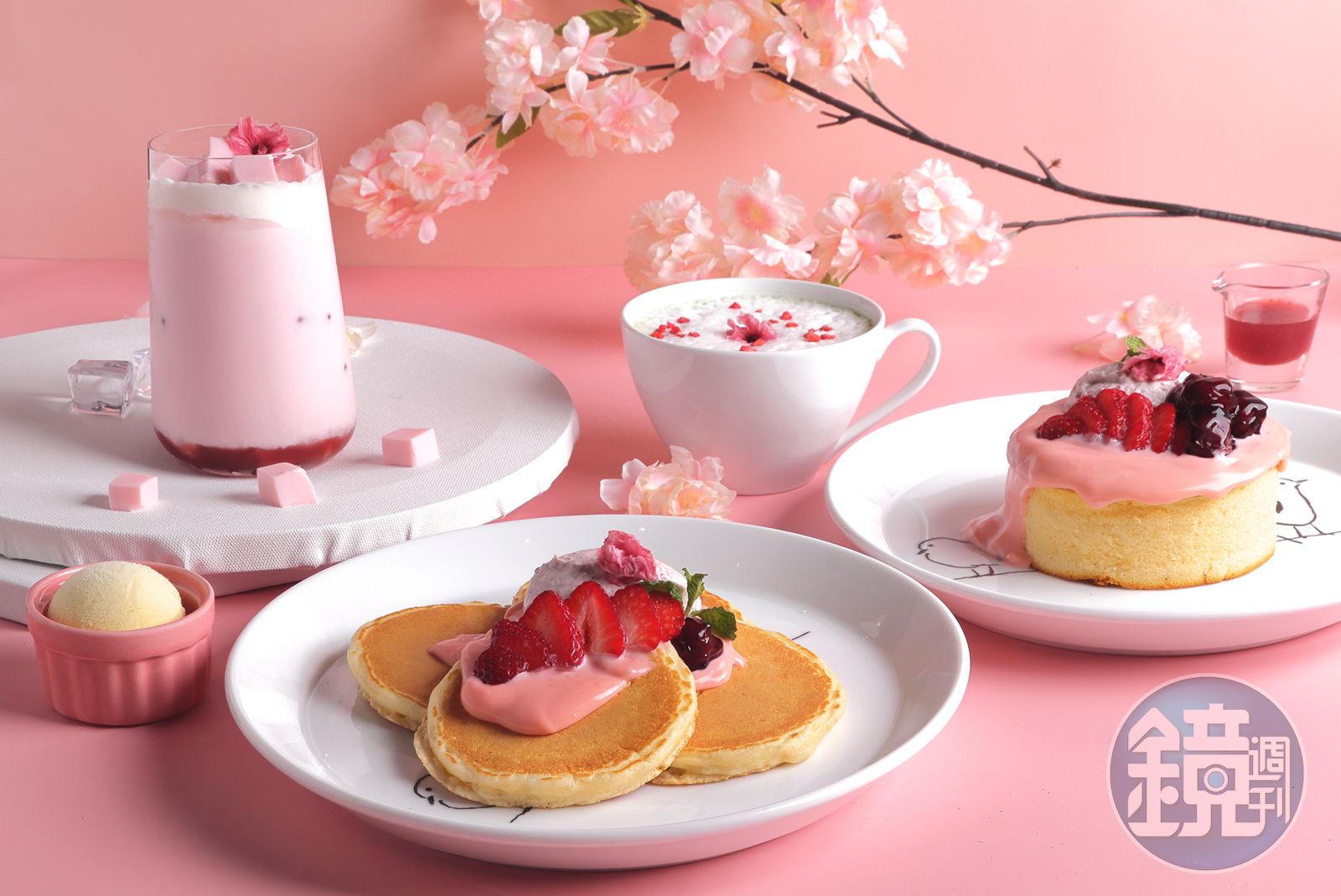 這回創辦人門崎杏子結合櫻花與櫻桃,融入在全新系列鬆餅。以不使用化學色素的天然製法,使用白巧克力、鮮奶油與草莓醬調製出櫻花緋粉色澤,口感滑順酸甜不膩口。