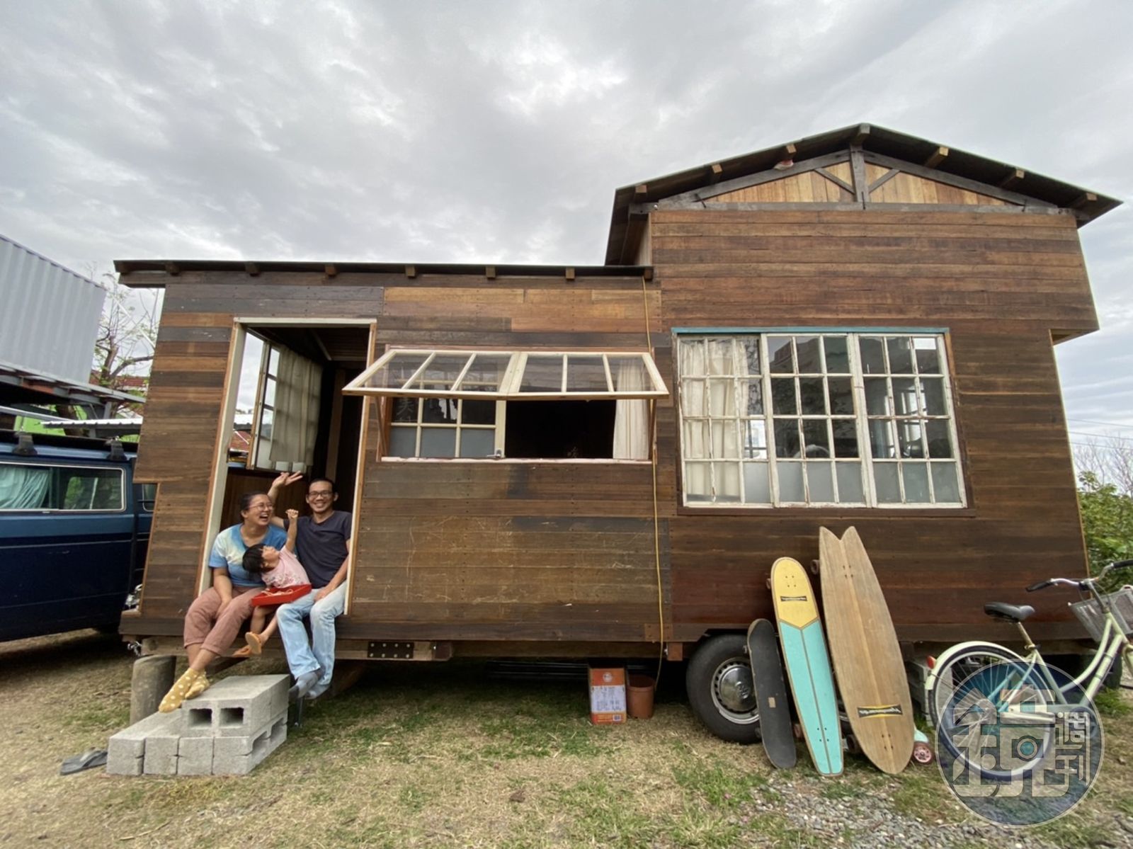 回台東居住幾年後,兩人收集和買進許多舊木料,預備自己蓋間可以生活的房子。後因孩子上學需要,兩人想在都蘭找一個新據點,發現糖廠前方的草地在出租,周邊還有固定廁所,加上吸收到國外Tiny House的知識,以蹦在兩年前開始打造可移動的「迷你屋」,從底盤開始,慢慢徒手建立起自己的神奇小屋。