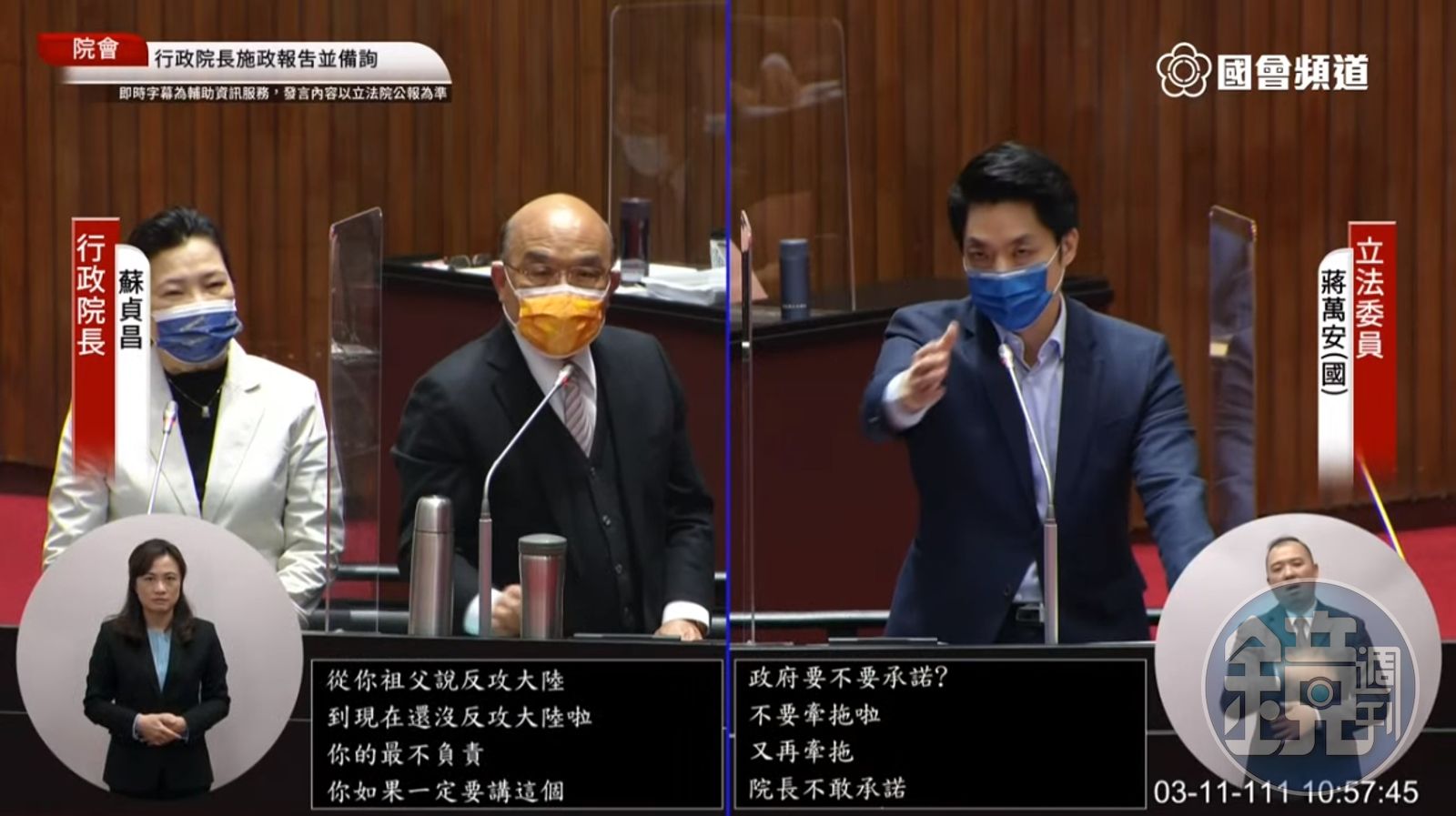 蔣萬安這時語氣不像前面那般強烈,但仍批蘇揆是面對國會議員不敢承諾還惱羞成怒,「不知道講到什麼地方去?」蘇揆繼續嗆:「講到你祖父了啦!是不是你祖父?」蔣萬安試圖將問題拉到再生能源,問蘇揆再生能源是否民進黨政府的政策,強調他監督政府天經地義,蘇揆也回擊:「我就著問題在跟你談,你老是講敢不敢?」蔣萬安向立法院長游錫堃要求主持秩序,蘇揆見狀再批「又要什麼求救了是不是?」他強調,現在正努力往政策方向在走,也很努力在扛過去留下來的種種攤子,但蔣萬安只會狂問敢不敢:「你這是為了選舉在叫什麼」。