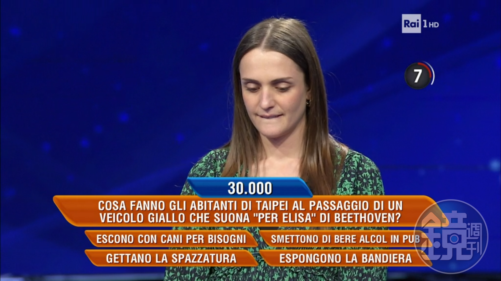 駐義代表在臉書分享,最近看義大利的益智節目又看到「台灣」了。該節目主持人出題問到台上僅存的3名選手,當一台黃色的車經過,播著貝多芬的〈給愛麗絲〉,身為台北的居民要做什麼?答案共有4個選項,分別為1.該帶狗狗出去散步;2.Pub裡面不能喝酒;3.該倒垃圾了;4.大家把國旗拿出來展示。