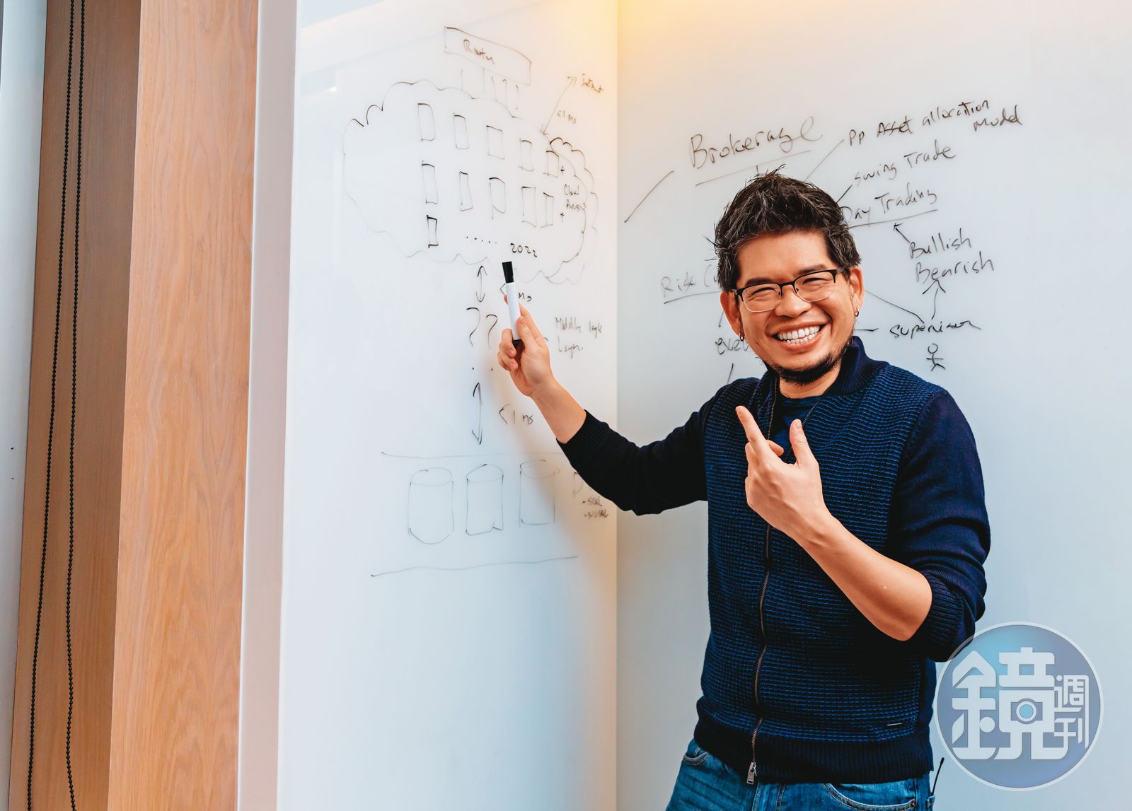 30坪空間,洋溢著濃濃的矽谷風,看不到個人辦公室,只有二排開放式辦公區。最醒目,莫過於玻璃帷幕設計的會議室,牆面寫滿密密麻麻文字,一見本刊來訪,馬上有員工上前整理牆面。原來陳士駿突發奇想時,會跑進會議室,與員工開會討論,記下重要事項。