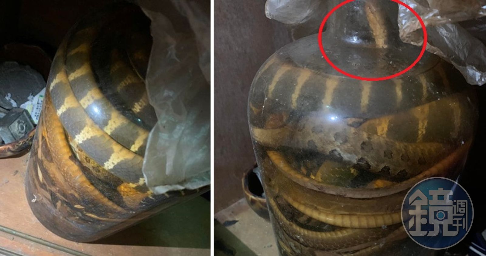 這名網友在臉書社團「爆廢公社」貼出數張照片並表示,最近在朋友老家挖到一罐蛇酒,預估應該是已存放20至30年時間,因為他也不敢打開查看,於是好奇發問:「還可以喝嗎?」