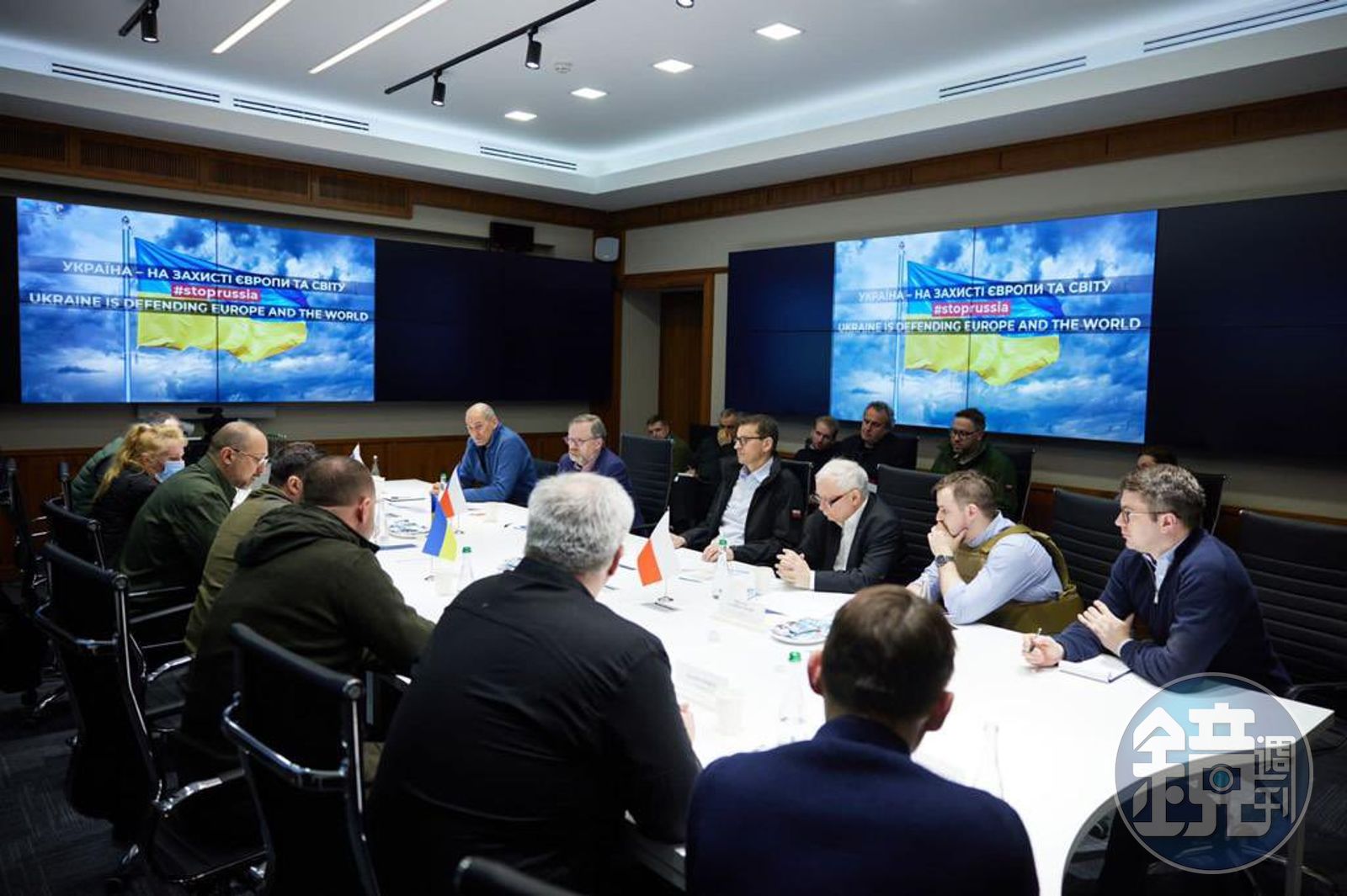 綜合外媒報導,波蘭總理莫拉維茨奇(Mateusz Morawiecki)、、捷克總理費亞拉(Petr Fiala)、斯洛維尼亞總理楊薩(Janez Janša)等3人在15日以歐盟國家代表身分,搭火車前往基輔,並在當地時間晚上和澤倫斯基等高層會面,了解目前的戰況發展,交換資訊,以行動力挺烏克蘭。